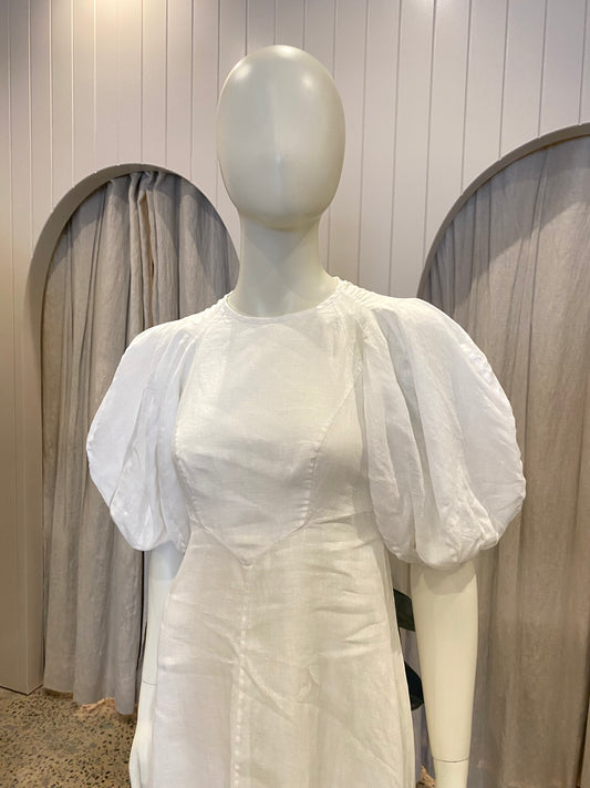 Zimmermann Puff Sleeve Linen Midi Dress in White - Size 0 (8)