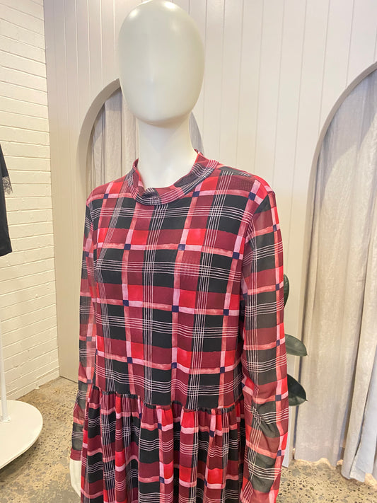 Kuwaii Burgundy Plaid Midi Dress - Size 14