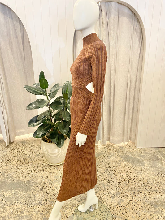 Shona Joy Brandy Brown Kamari Long Sleeve Cut Out Midi Dress - Size M (10/12)
