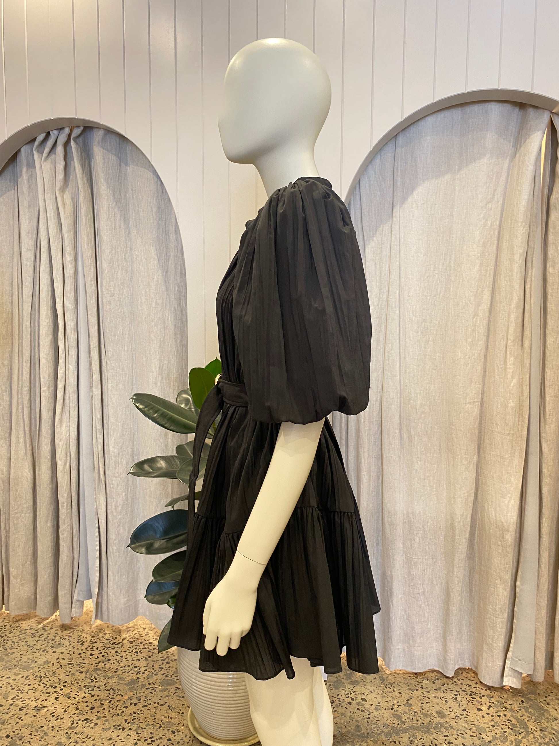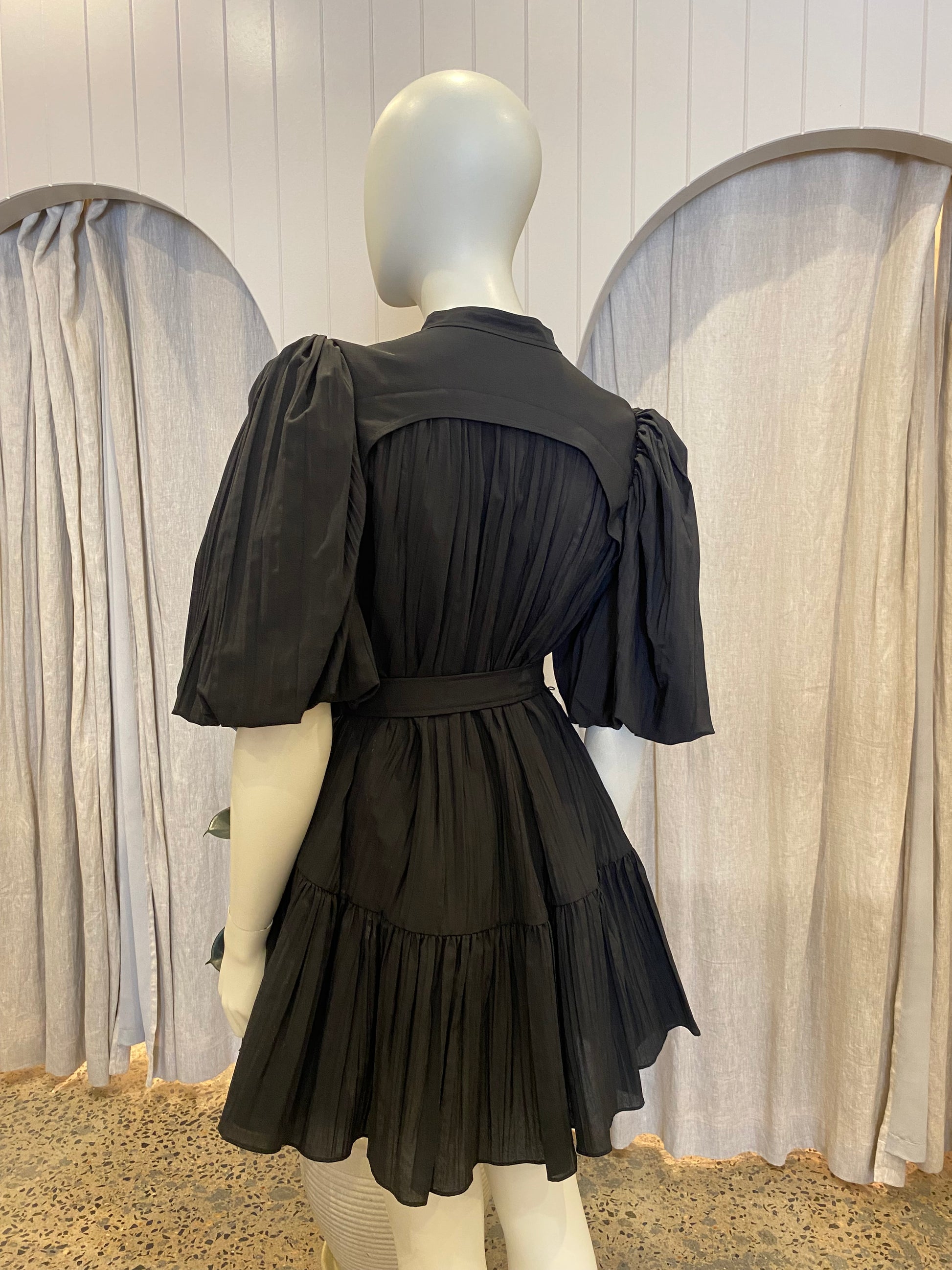 Description : - A free flowing style - Accentuated sleeves - Self covered buttons - Soft frill toward the hem - Removable waist belt - Luxurious gold hardware. - Mini length - Unlined -
