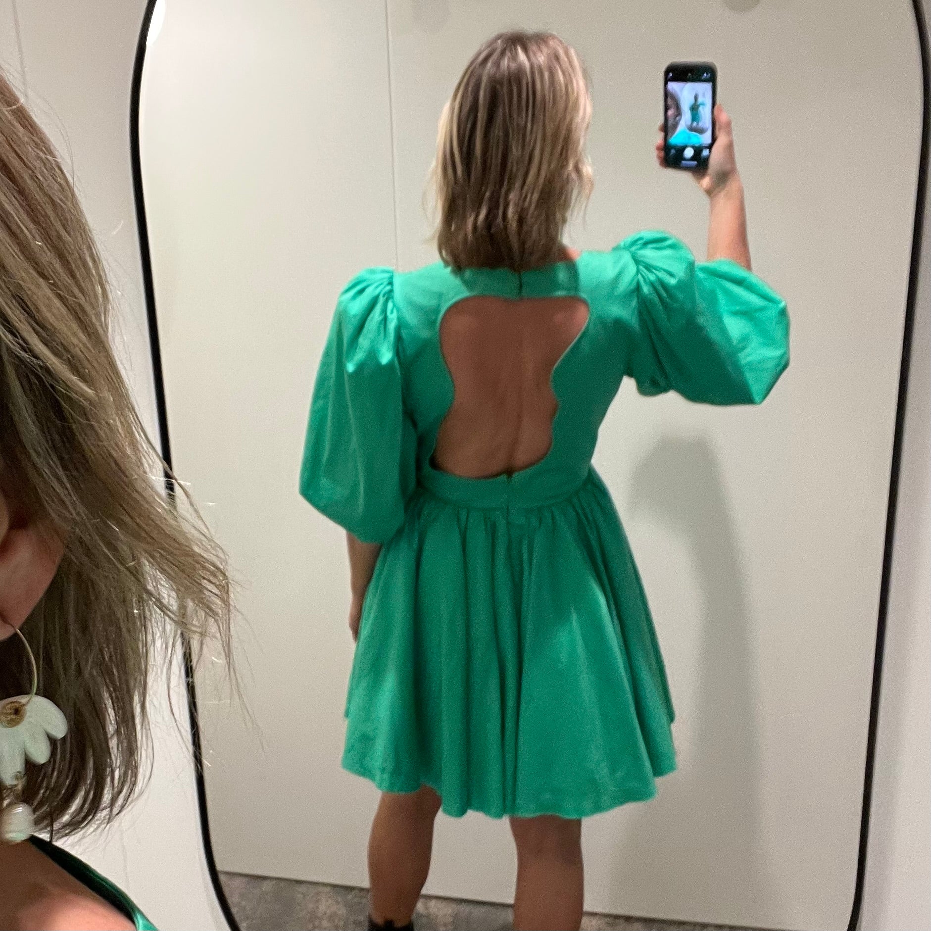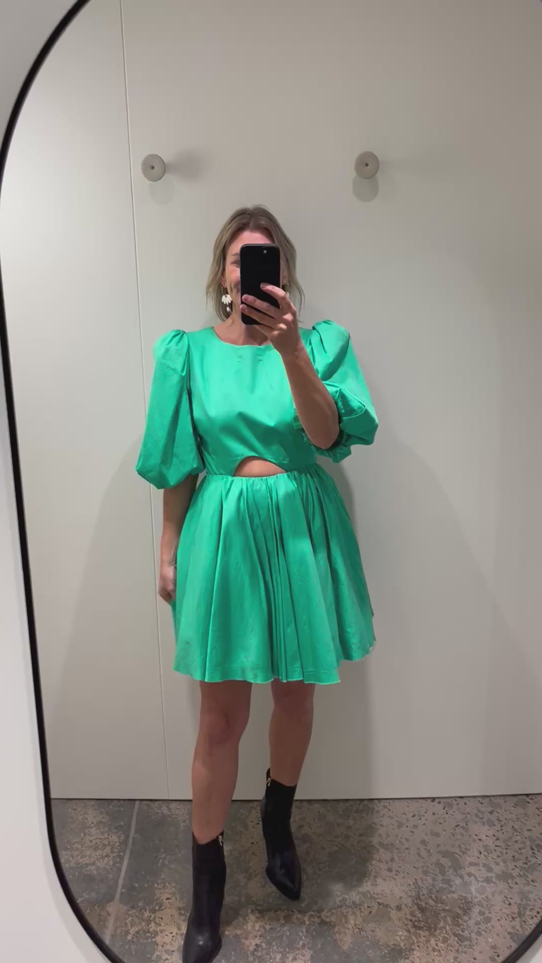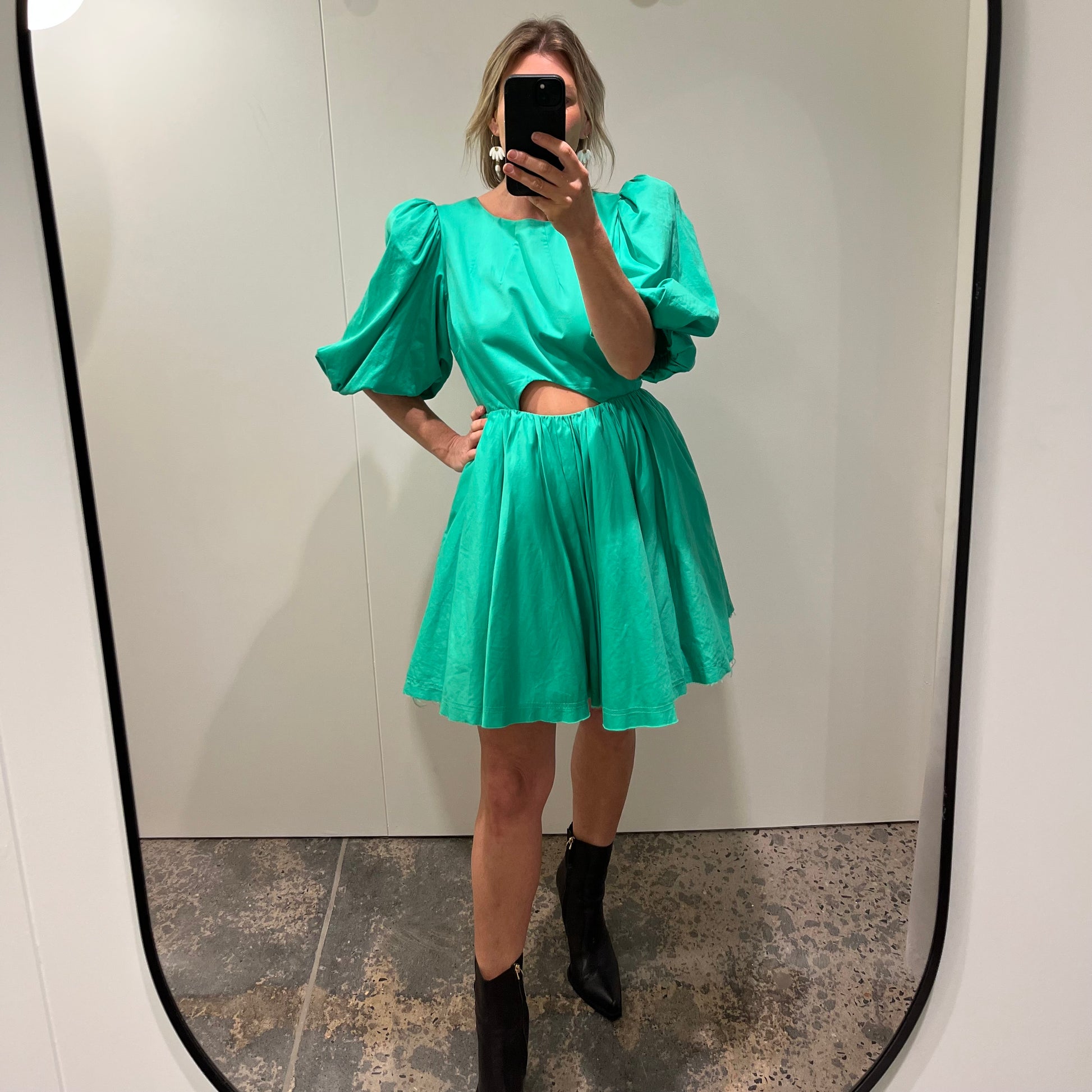 Description : - Fitted bodice with waist cut out at centre front - Abstract cut out at back bodice - Short puff sleeves - Gathered mini skirt with side seam pockets - Button and loop closure at centre back neck - Invisible zip closure at centre back skirt - Lined