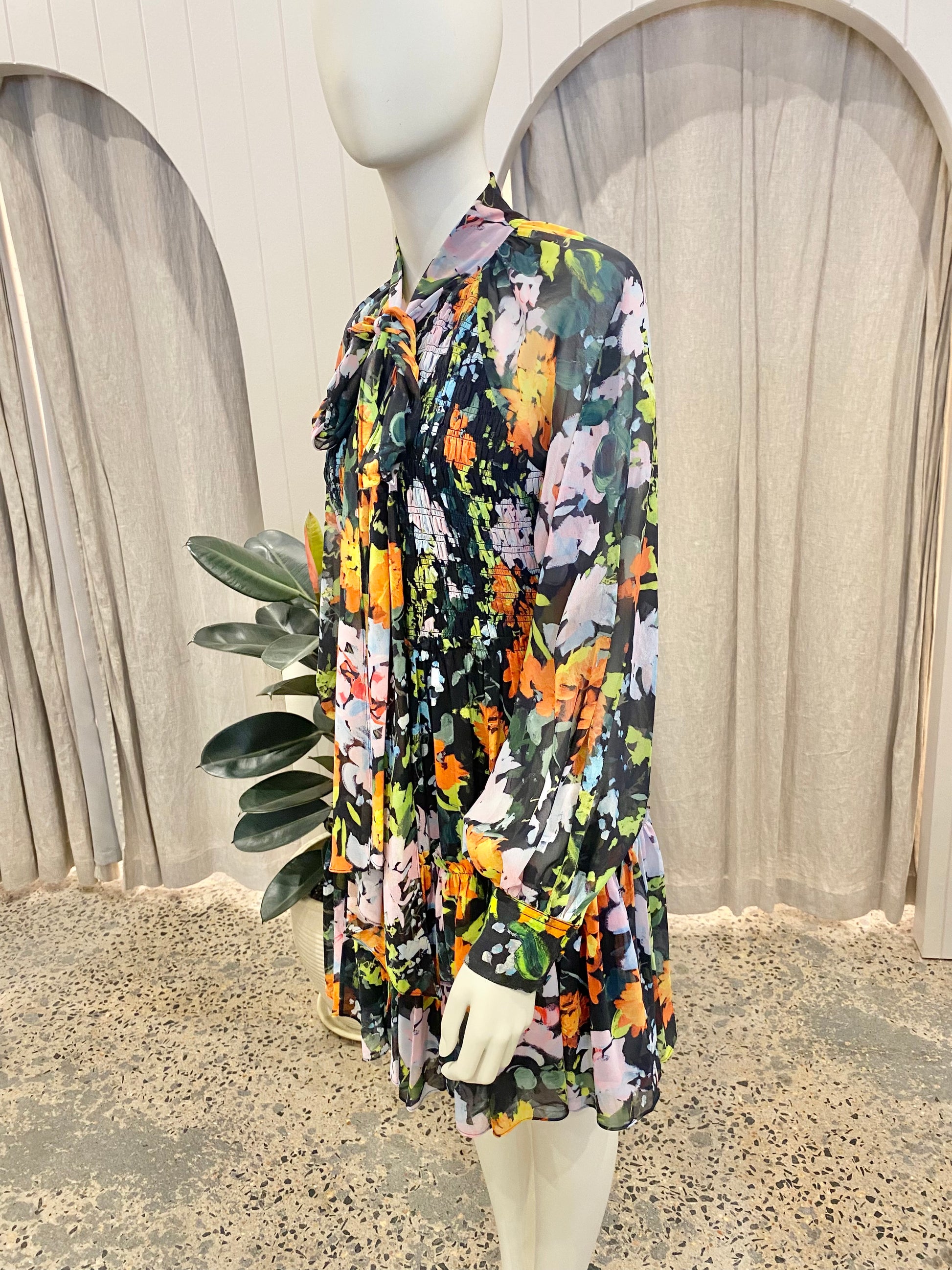 Description : - Mini dress - Bow necktie - Elastic shirred bodice - Full blouson sleeves - Gathered skirt with raw edging