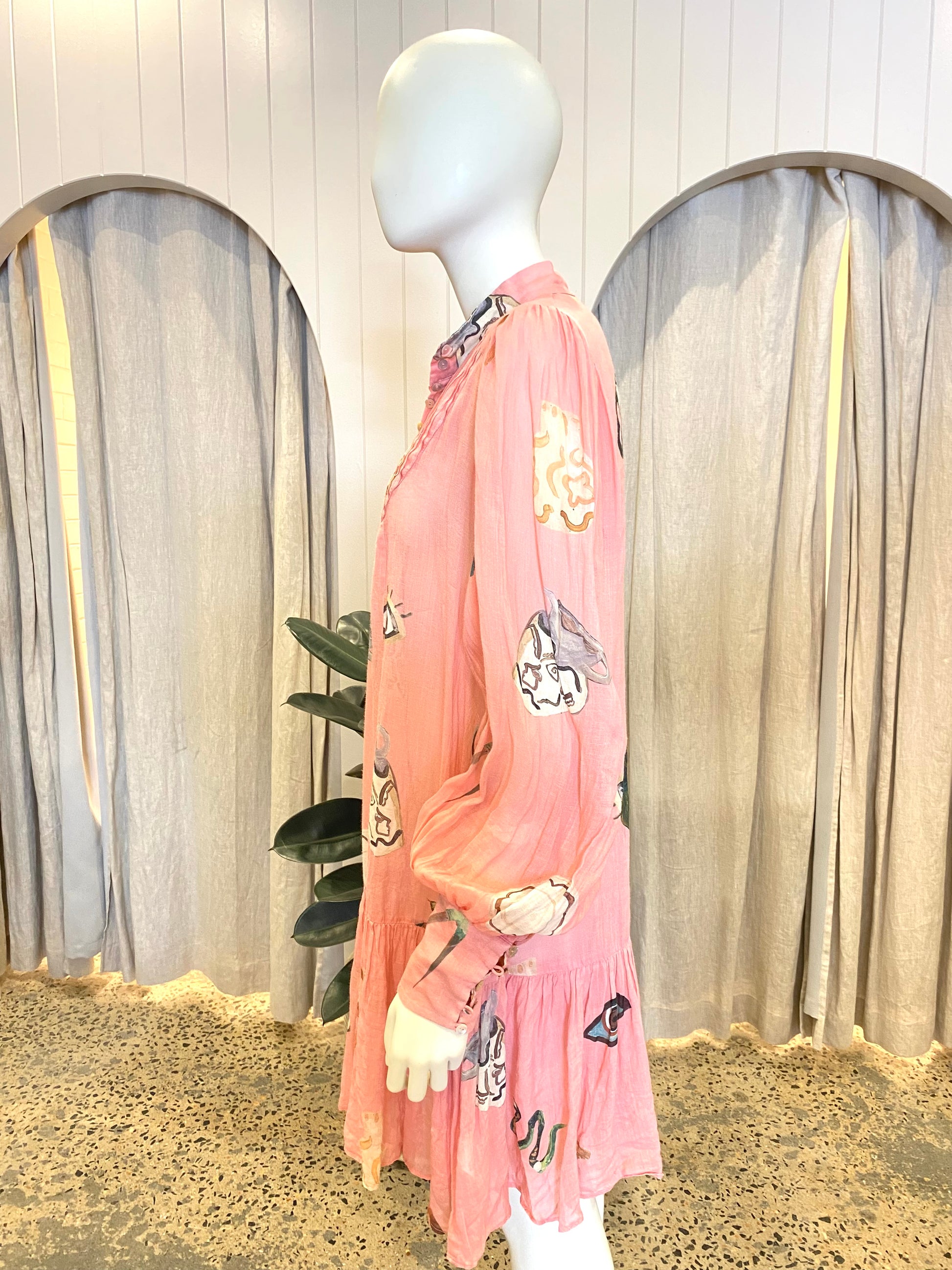 Description : - Stand collar with pleated yoke detail - Shell button fastening on placket - Ballon sleeve with fitted cuff and shell buttons - Gathered hem frill - Slip is included
