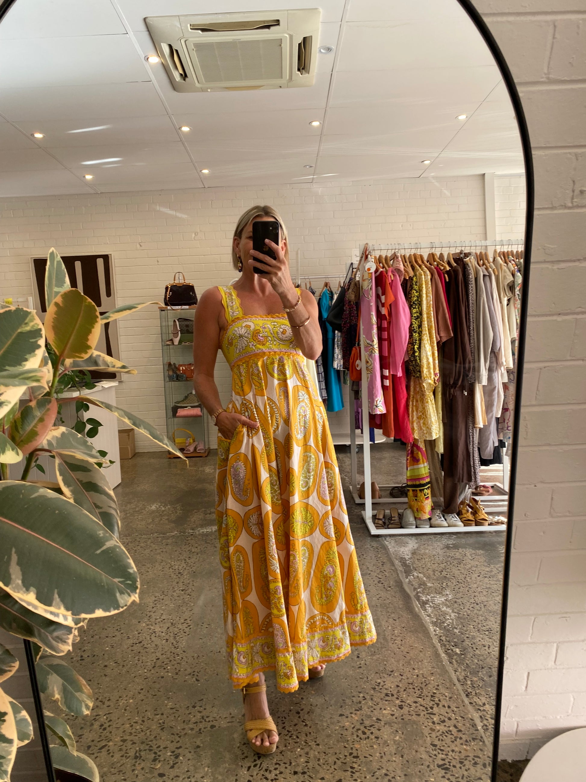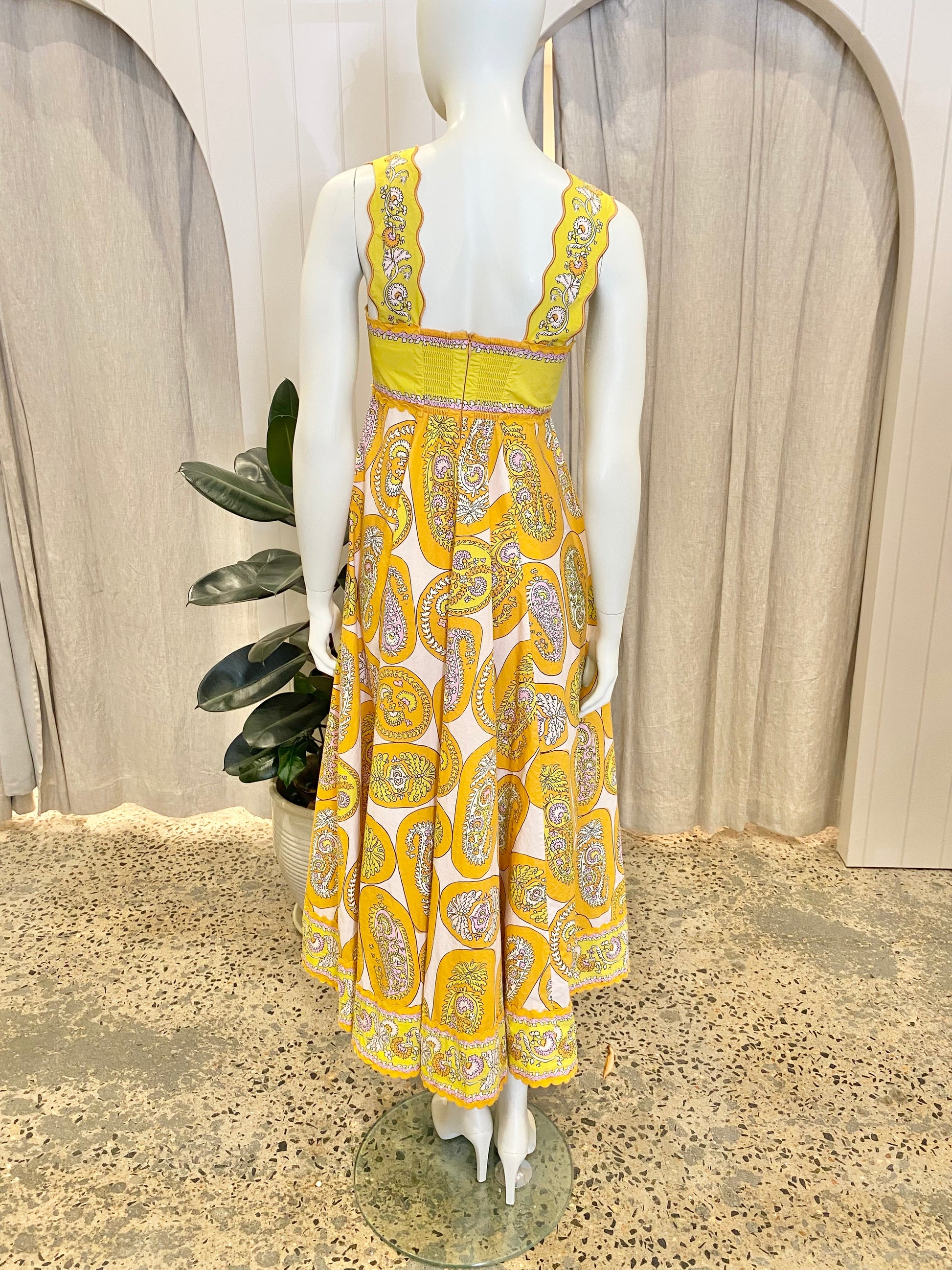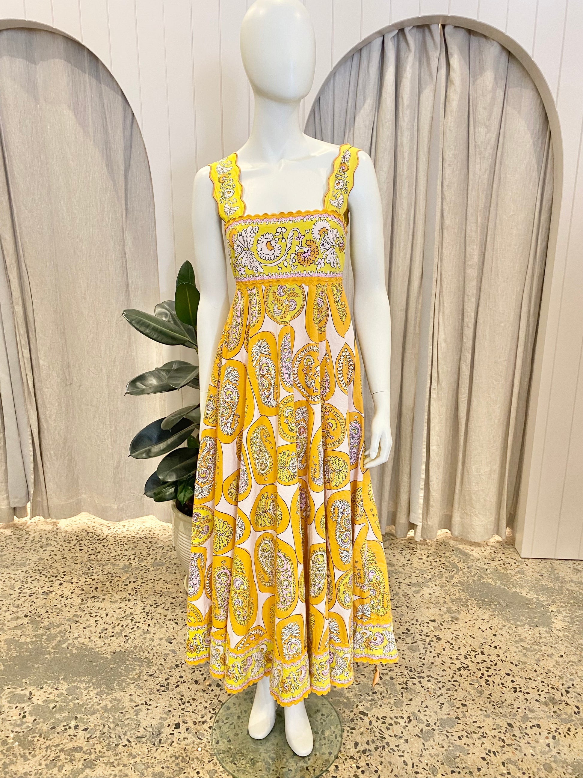 Description : - Relaxed midi dress silhouette - Straight neckline - Embroidered straps with ric-rac trim - Inseam pockets - Zip closure at centre back