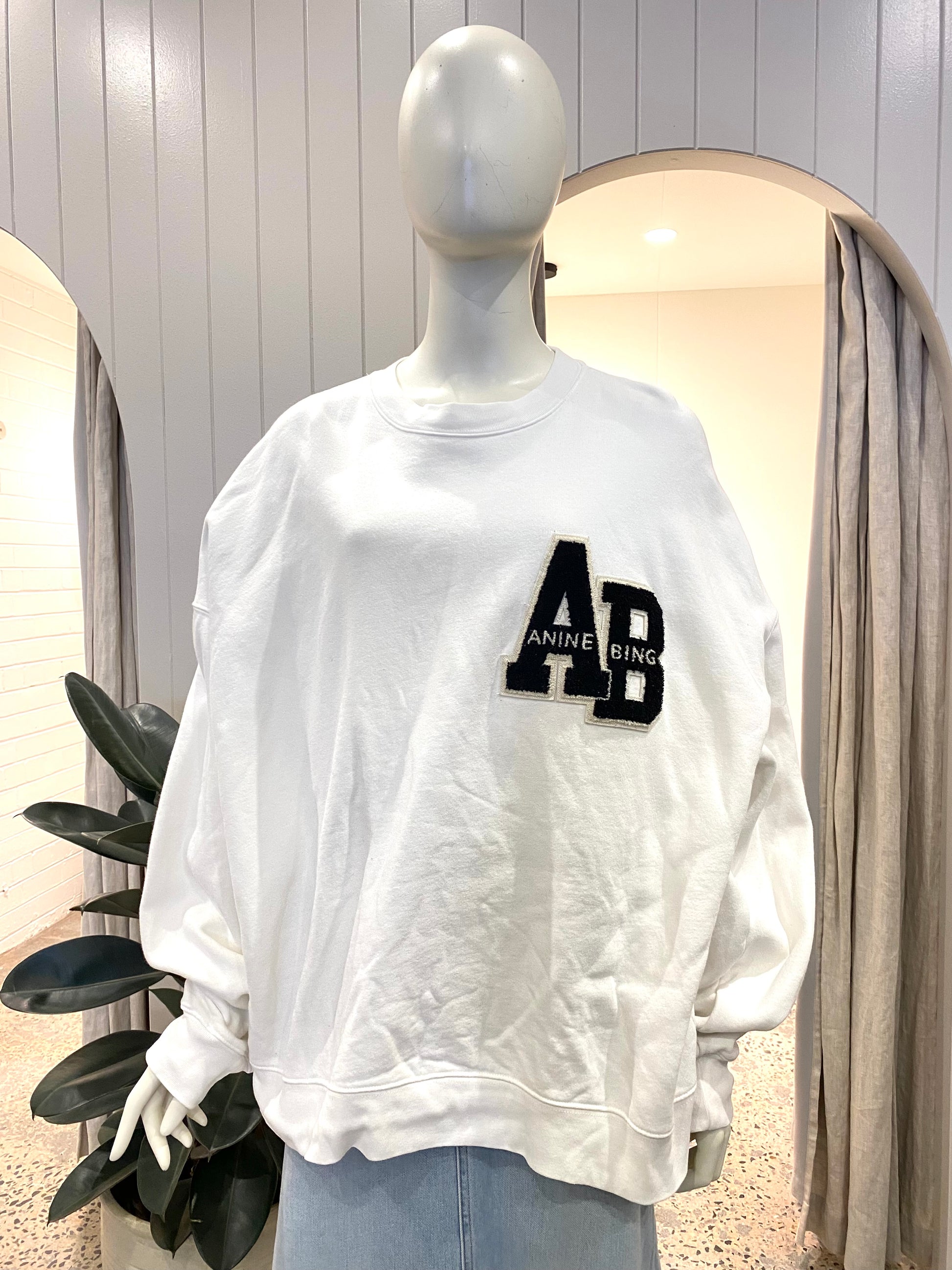 Description : The Miles Oversized Sweatshirt Letterman is an oversized crewneck pullover made from midweight 100% organic cotton fleece in off white. Features a custom ANINE BING letterman chenille patch graphic at the chest in black and cream.