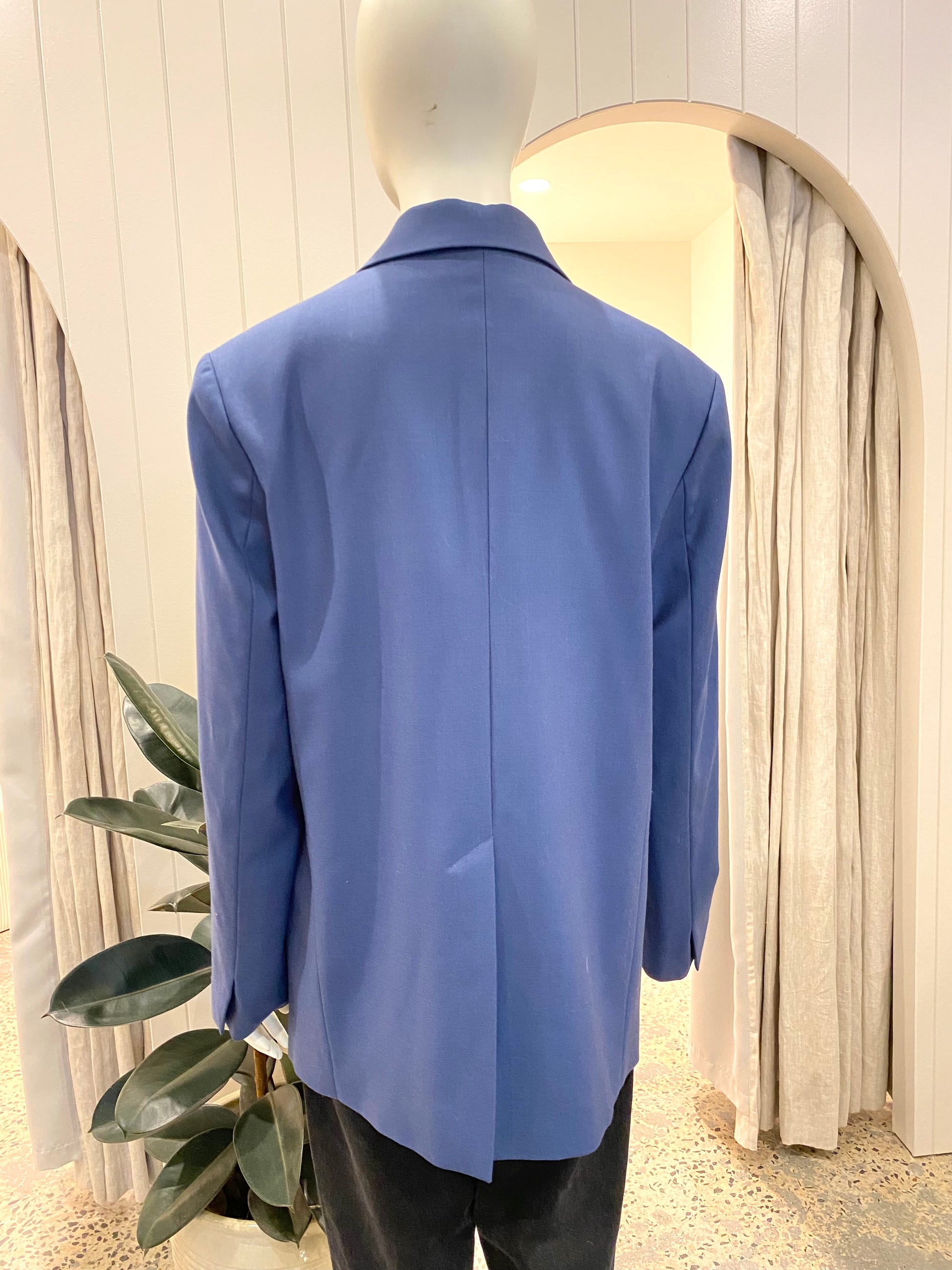 Description : Blue wool single-breasted blazer with shoulder pads and back vent.