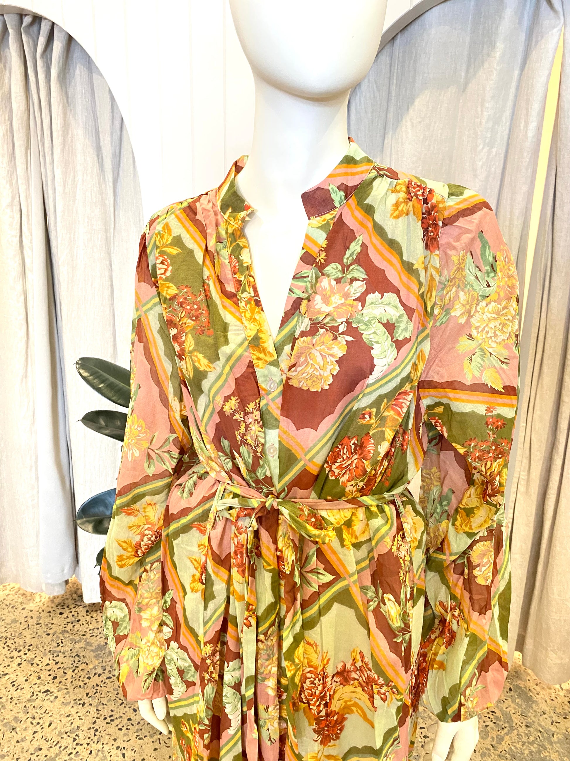 Description : - Pure cotton voile; lined - Mandarin collar - Long sleeves - Button-through front - Self-tie to waist - All-over print - Maxi length