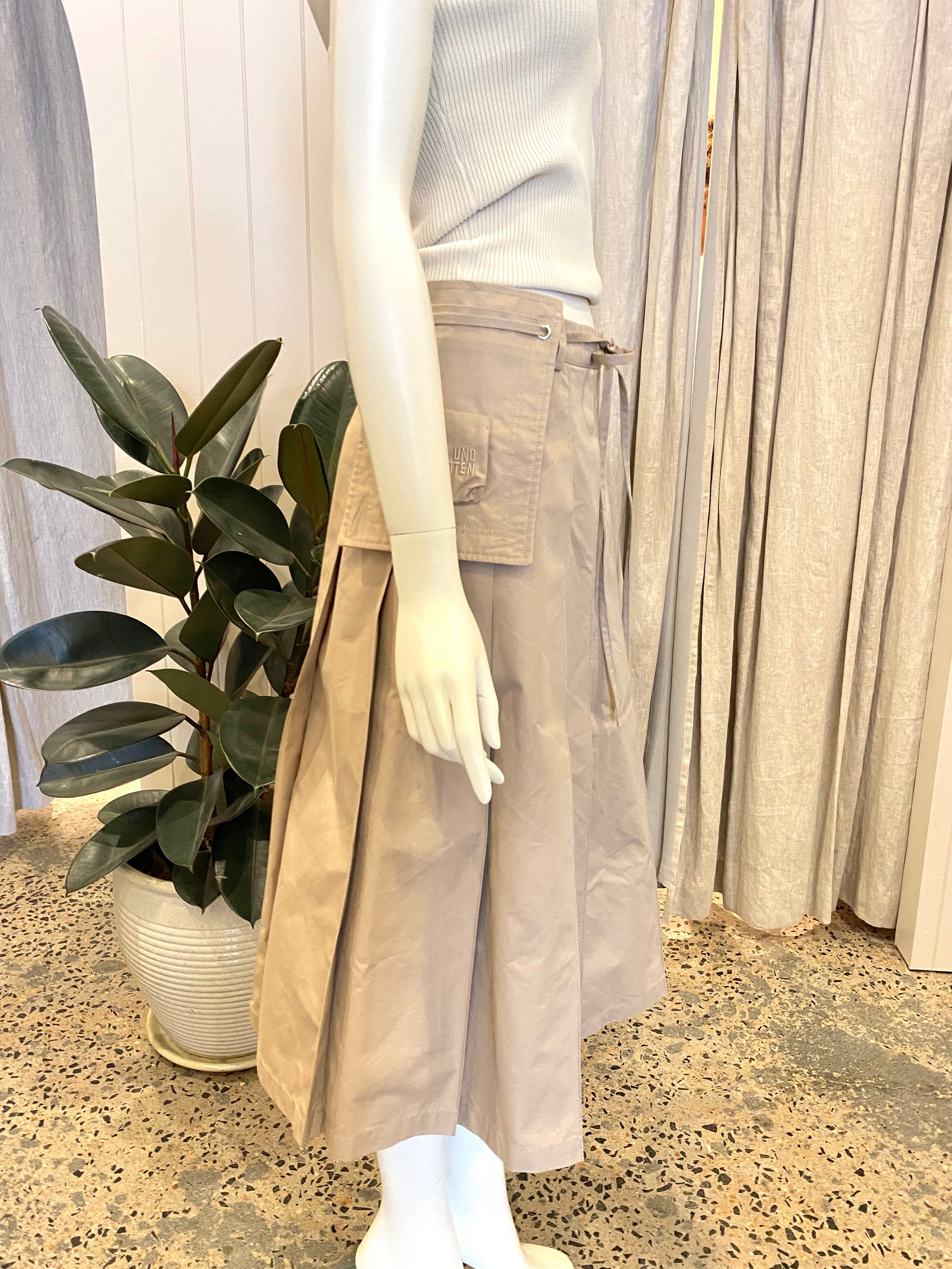 Description : Midi Skirt is a tan pleated midi-skirt, mid-waist fit, A-line silhouette, detachable pocket bag that can be tied around the waist