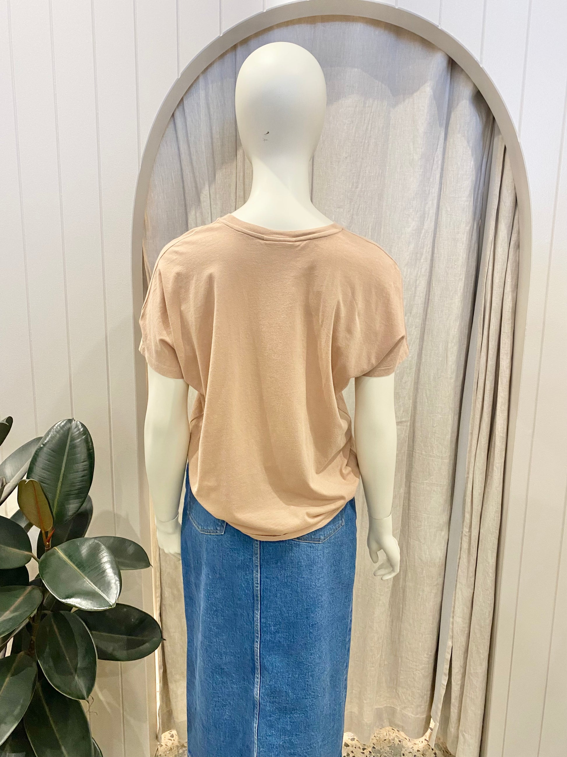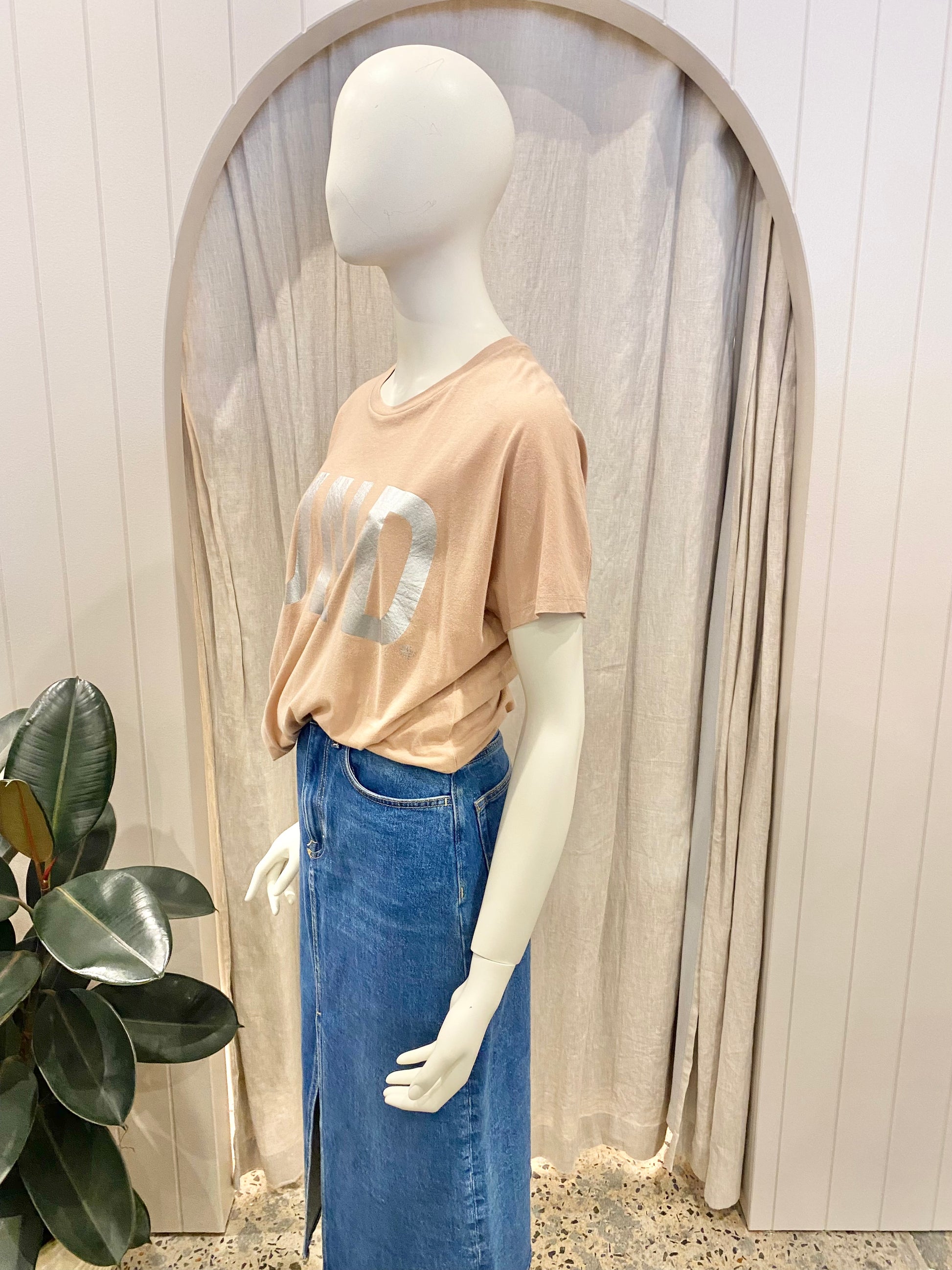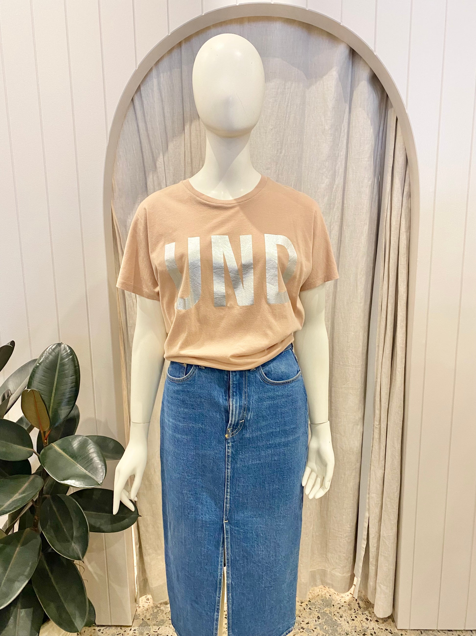 Description : tan logo tee, silver logo, round neckline, short sleeve