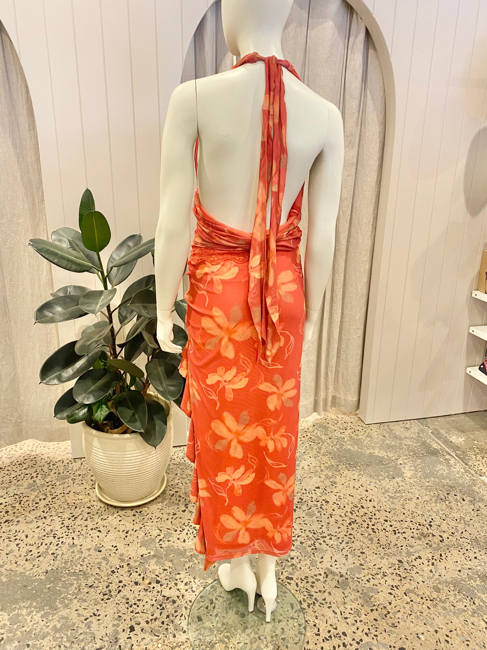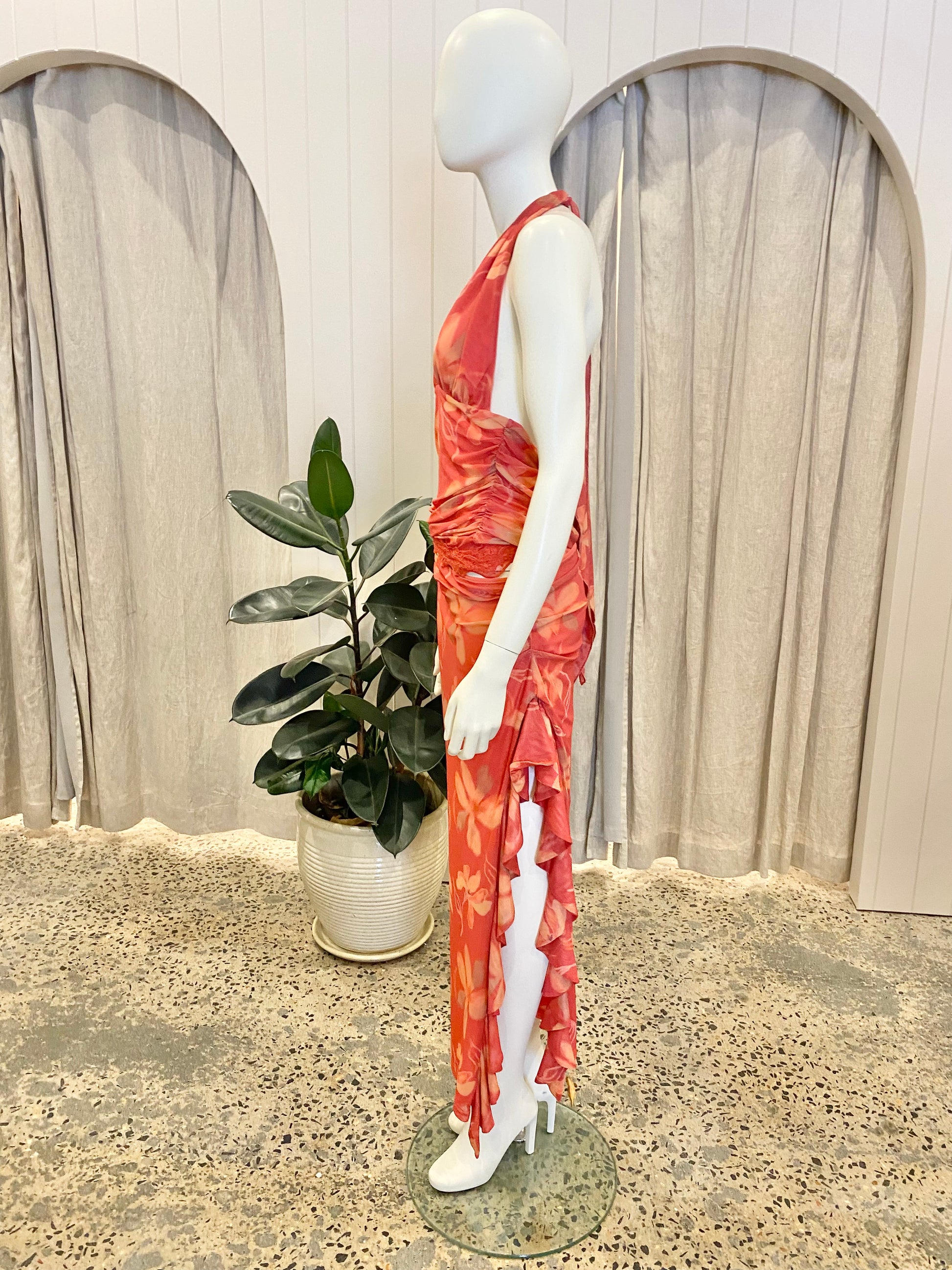 Description : The Penelope Maxi Dress is a summer-ready silhouette crafted from stretch mesh fabric. The bodice features a halter neck and gathers at the waist. The skirt, attached at the wearer’s left side, reveals a hint of the waist and boasts a high split with a ruffle along the hem. The bodice has ample stretch Self tie halter neck Bias cut woven skirt Thigh high split Fully lined in mesh fabric Total length is 146cm