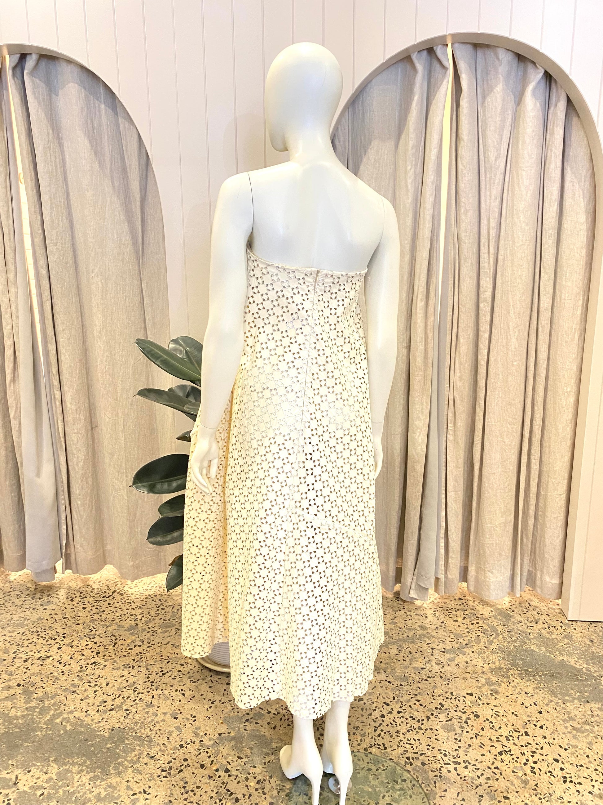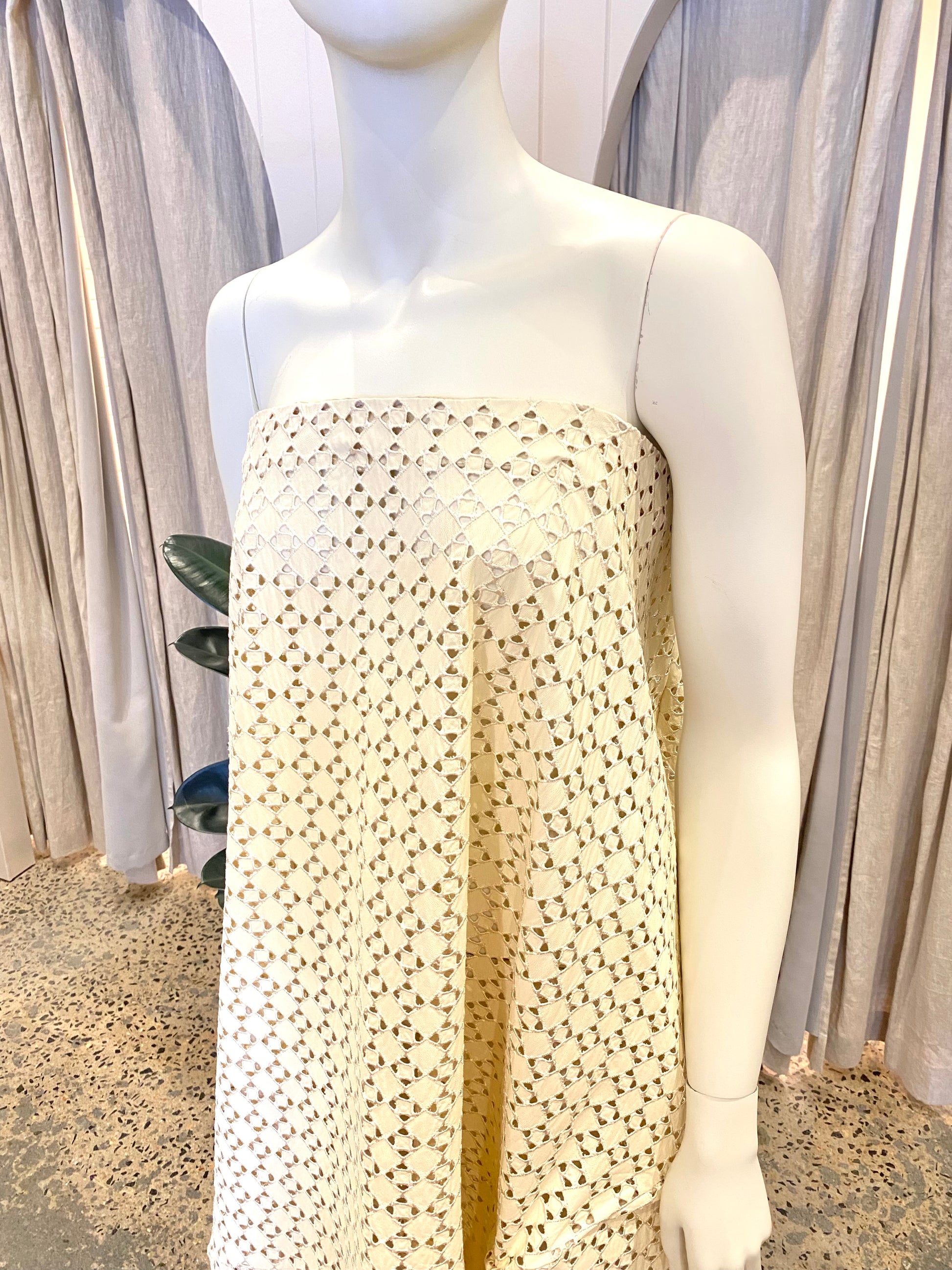 Description : A strapless neckline keeps things classic, while an asymmetrical hemline creates a modern silhouette. Made from remnant fabric, invisible zip at back, this dress is quite fitted at the top. - strapless neckline - asymmetrical hemline - fitted neckline - draped dress