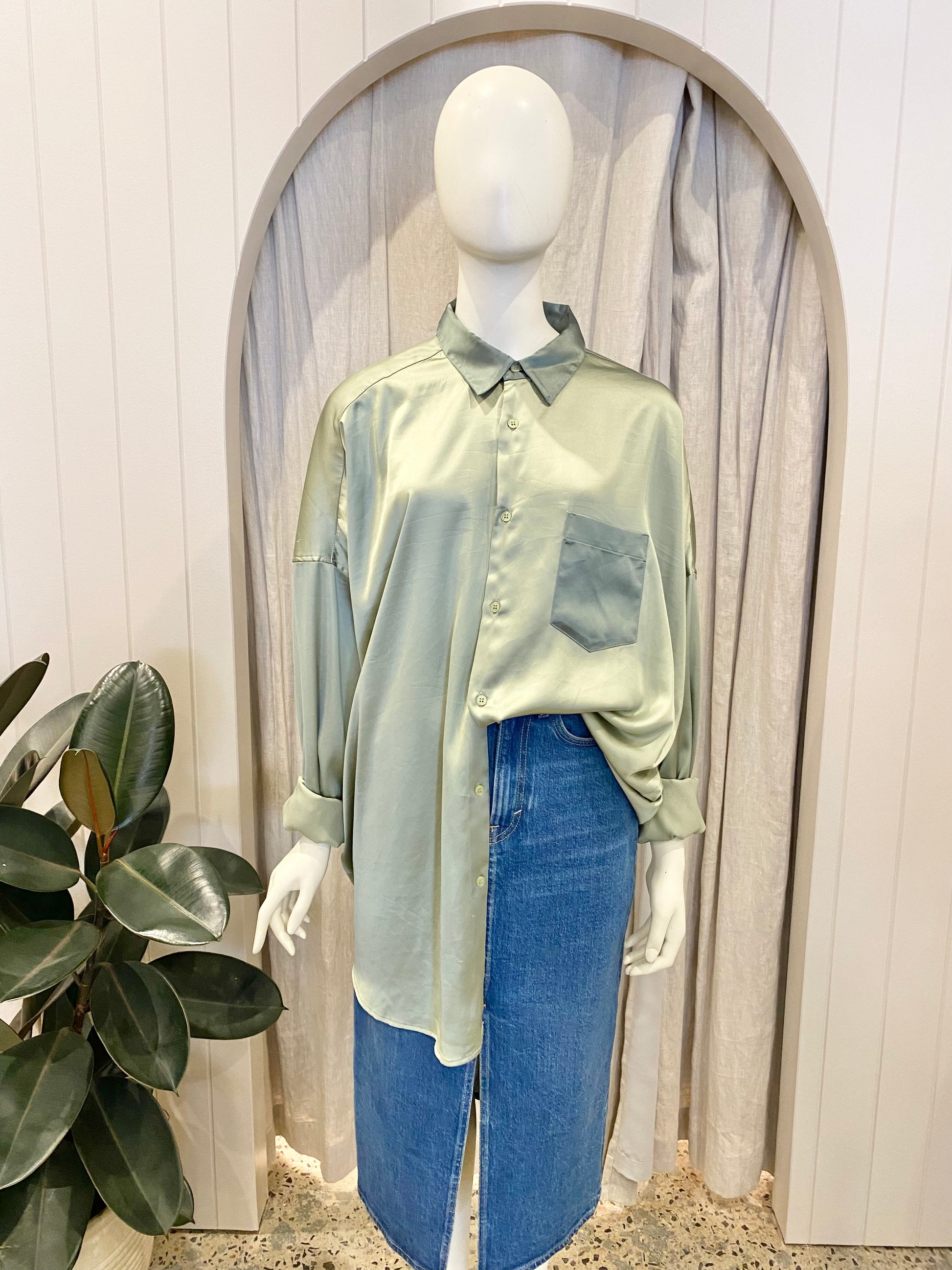 Description : - Made of a lightweight silky feel material for an effortless look. - Two-toned contrasting pocket and sleeve cuffs. - Button down front - Oversized relaxed fit
