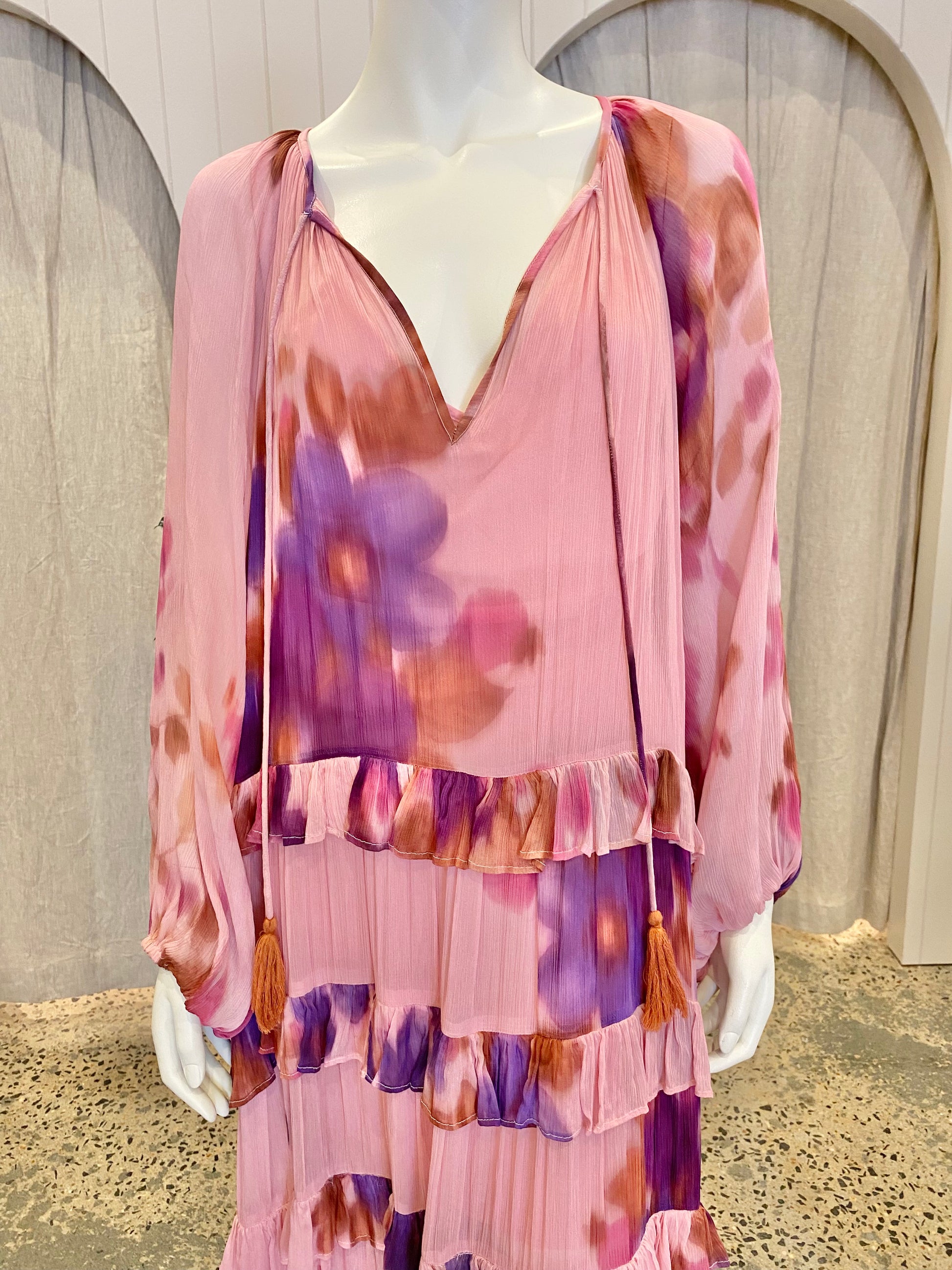 Description : v-neckline, maxi dress, long sleeves, with elasticated cuffs, tiered skirt