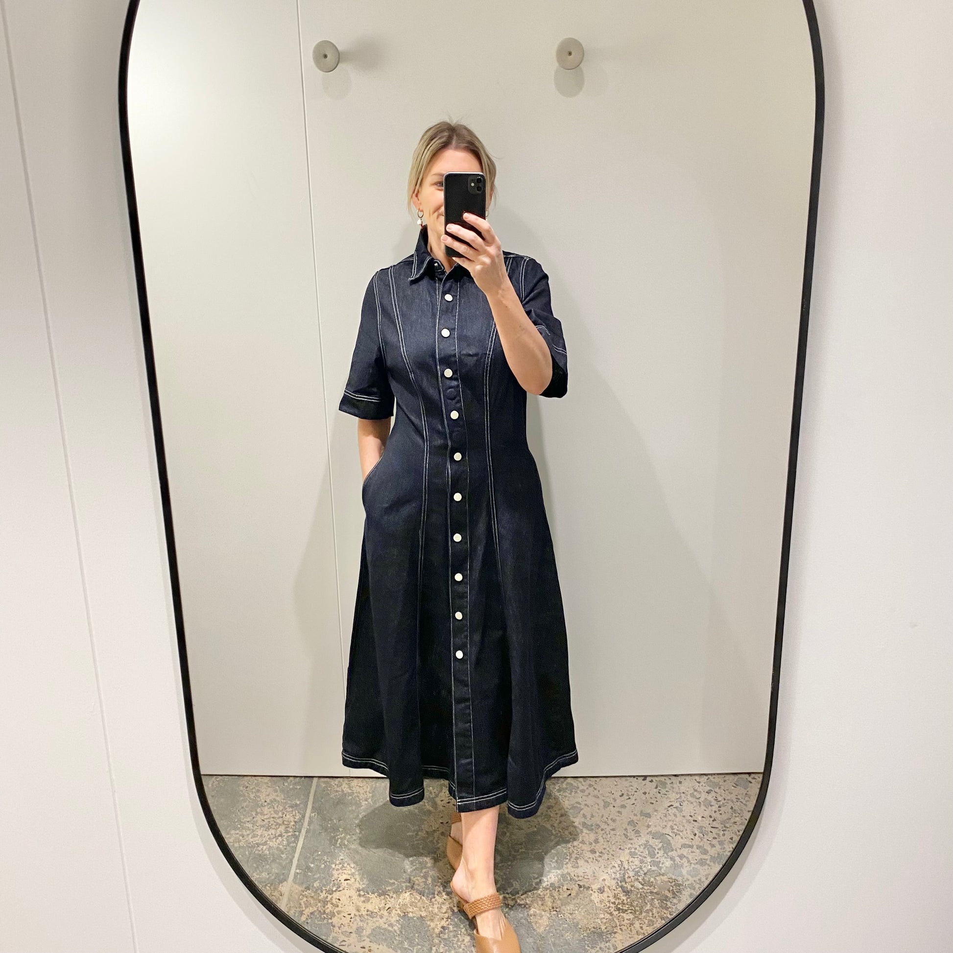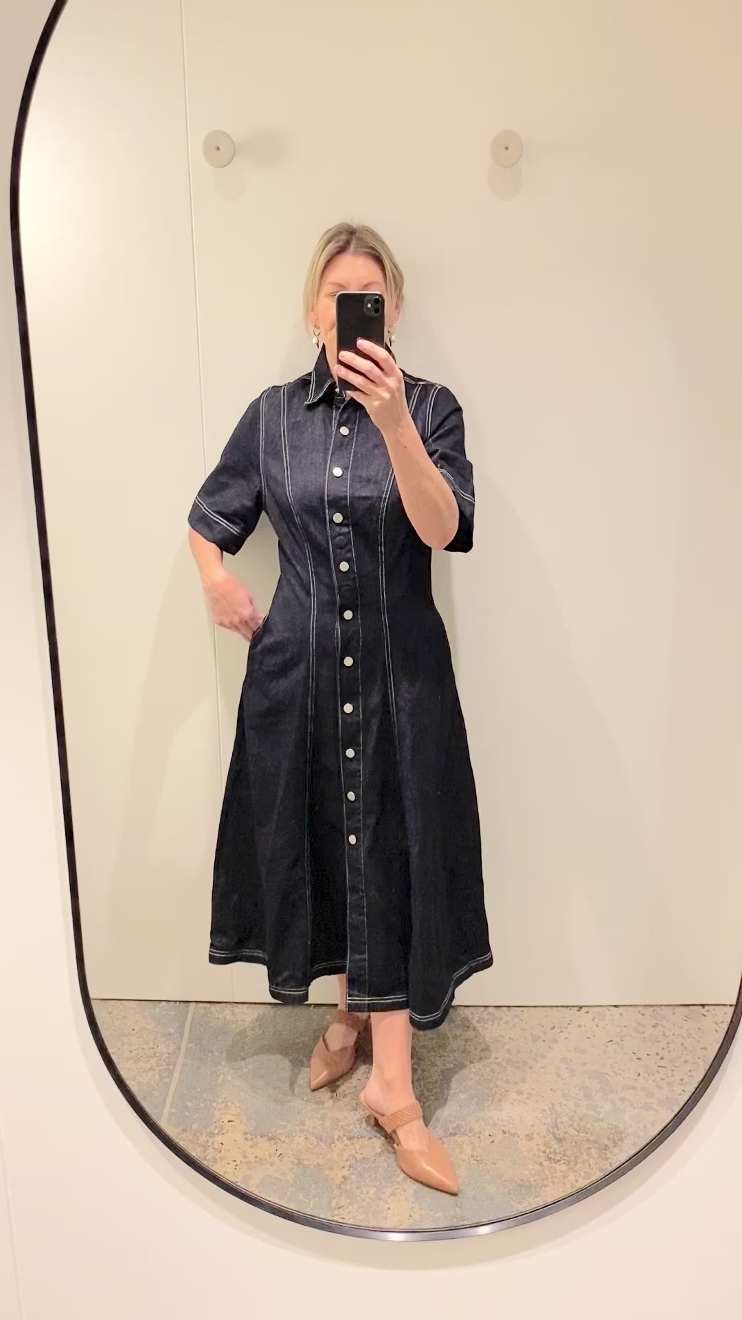 Description : - Bohemian Traders custom indigo wash - Heavyweight non-stretch fabric - Waisted wide sleeve midi denim dress - Fit and flare silhouette - This dress runs small, so if you are in between sizes, size up! - Snap buttons down center front - Side seam pockets