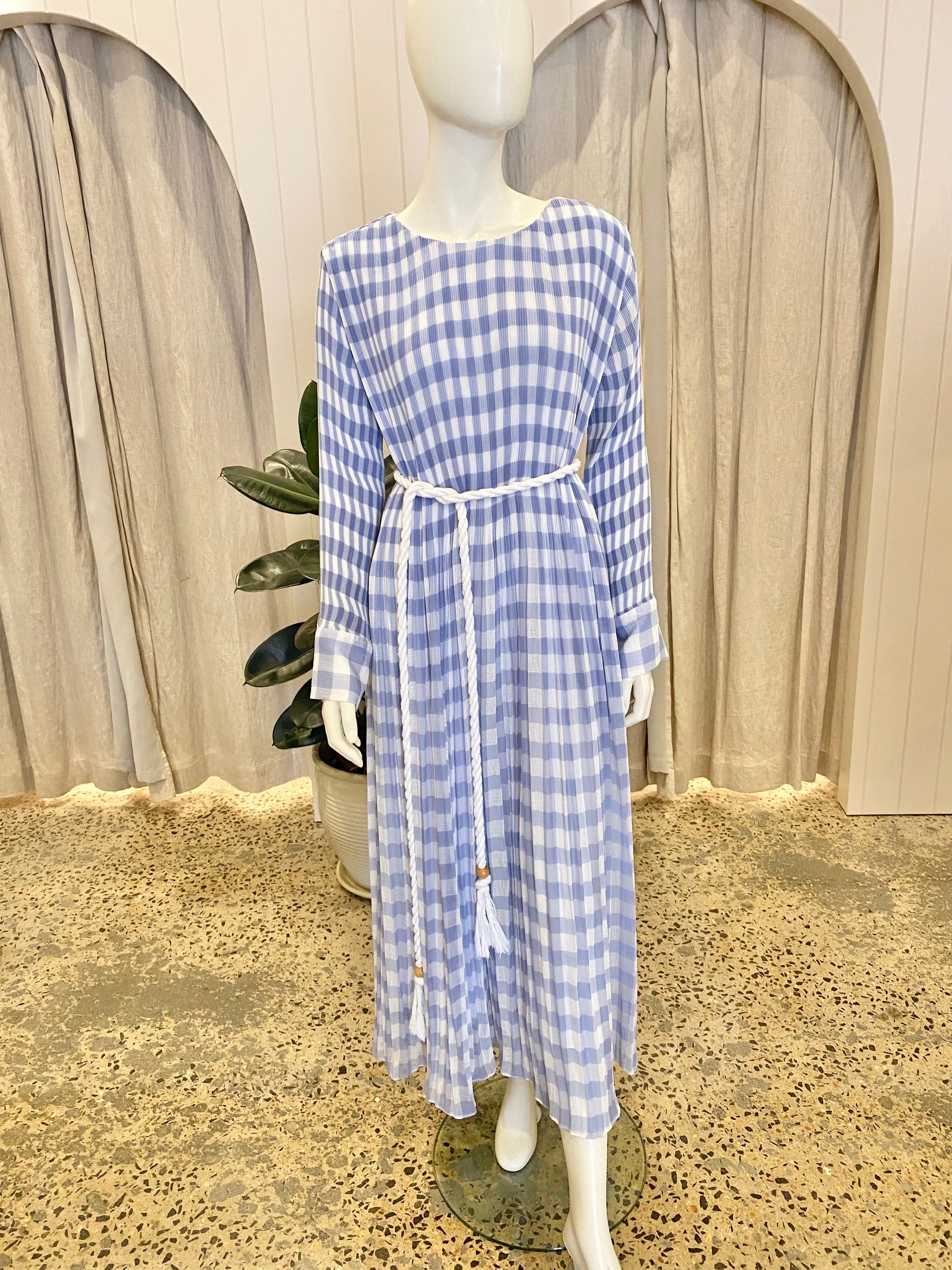 Description : French blue and white gingham maxi dress featuring a pleated skirt and bodice, long sleeves and buttoned cuffs.