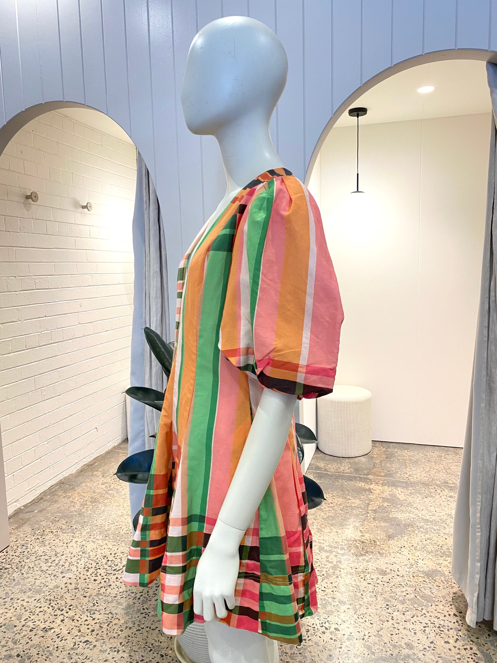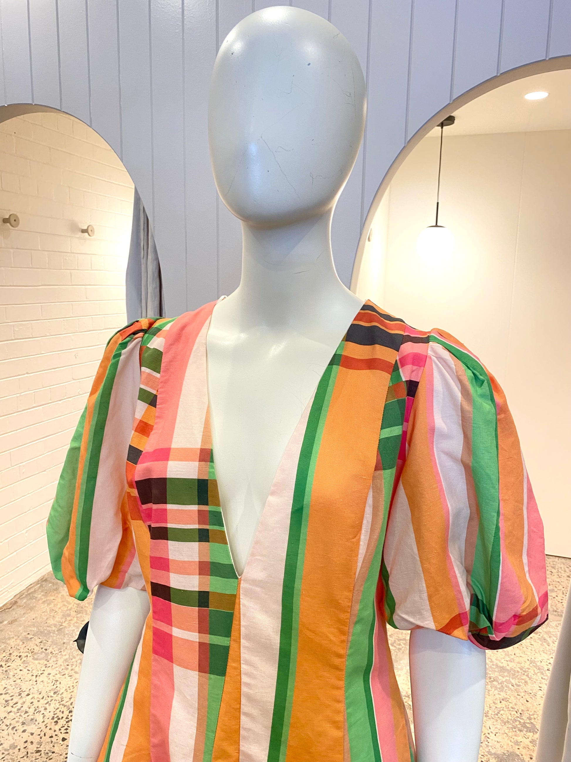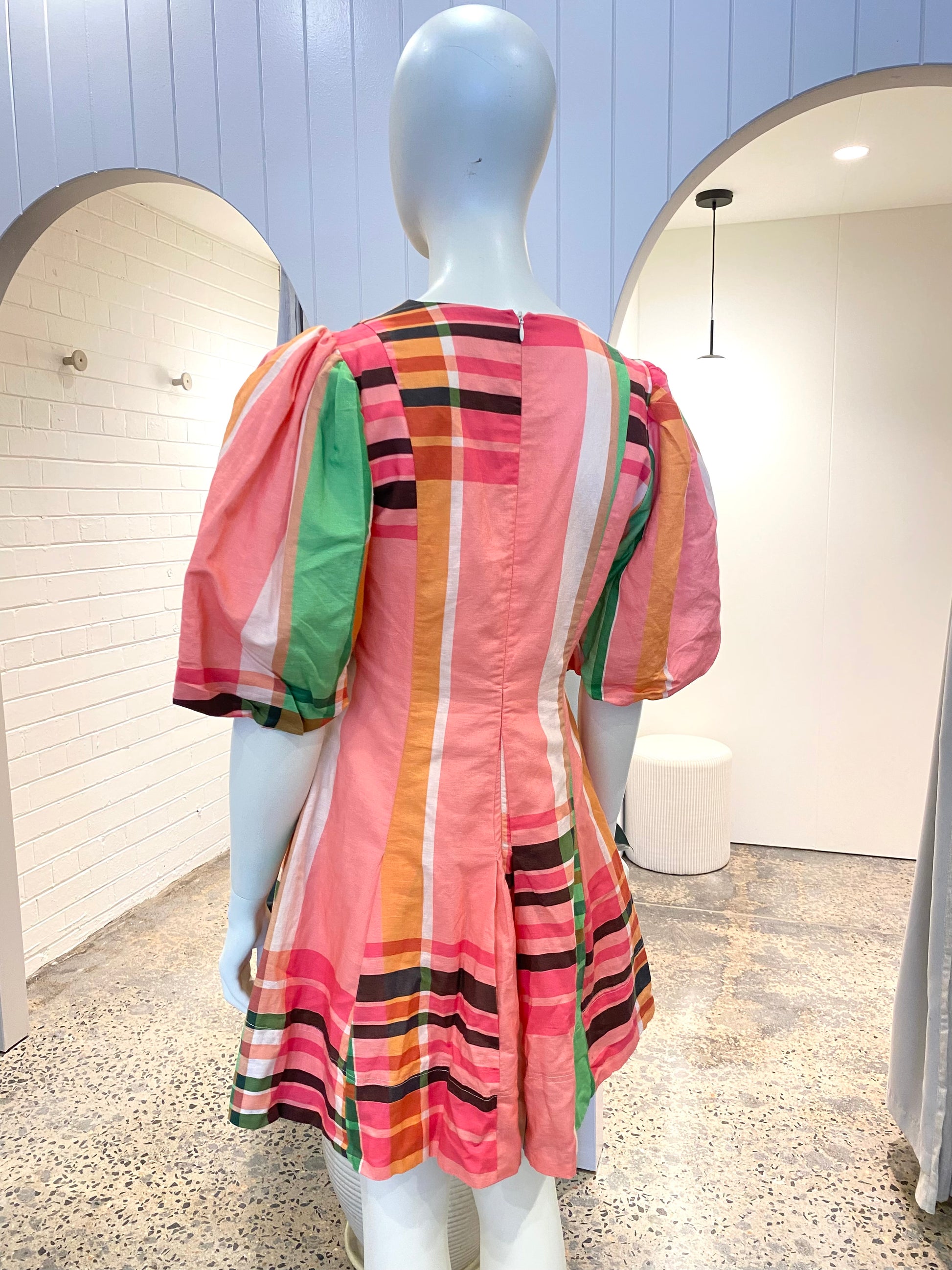 Description : - Exclusive print, - Short sleeve plunge v-neckline mini dress - Fully lined - Puff sleeve with encased gathered elastic sleeve at opening - Vertical panel seams - Internal pockets @ side seam - Fitted waist with topstitch pleat at skirt, wide bottom hem with twin needle feature stitch, YKK invisible coil zip @ centre back