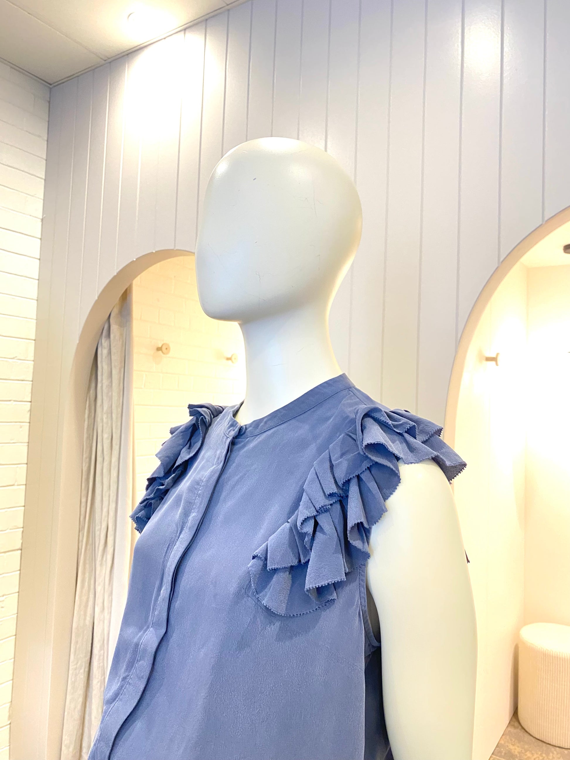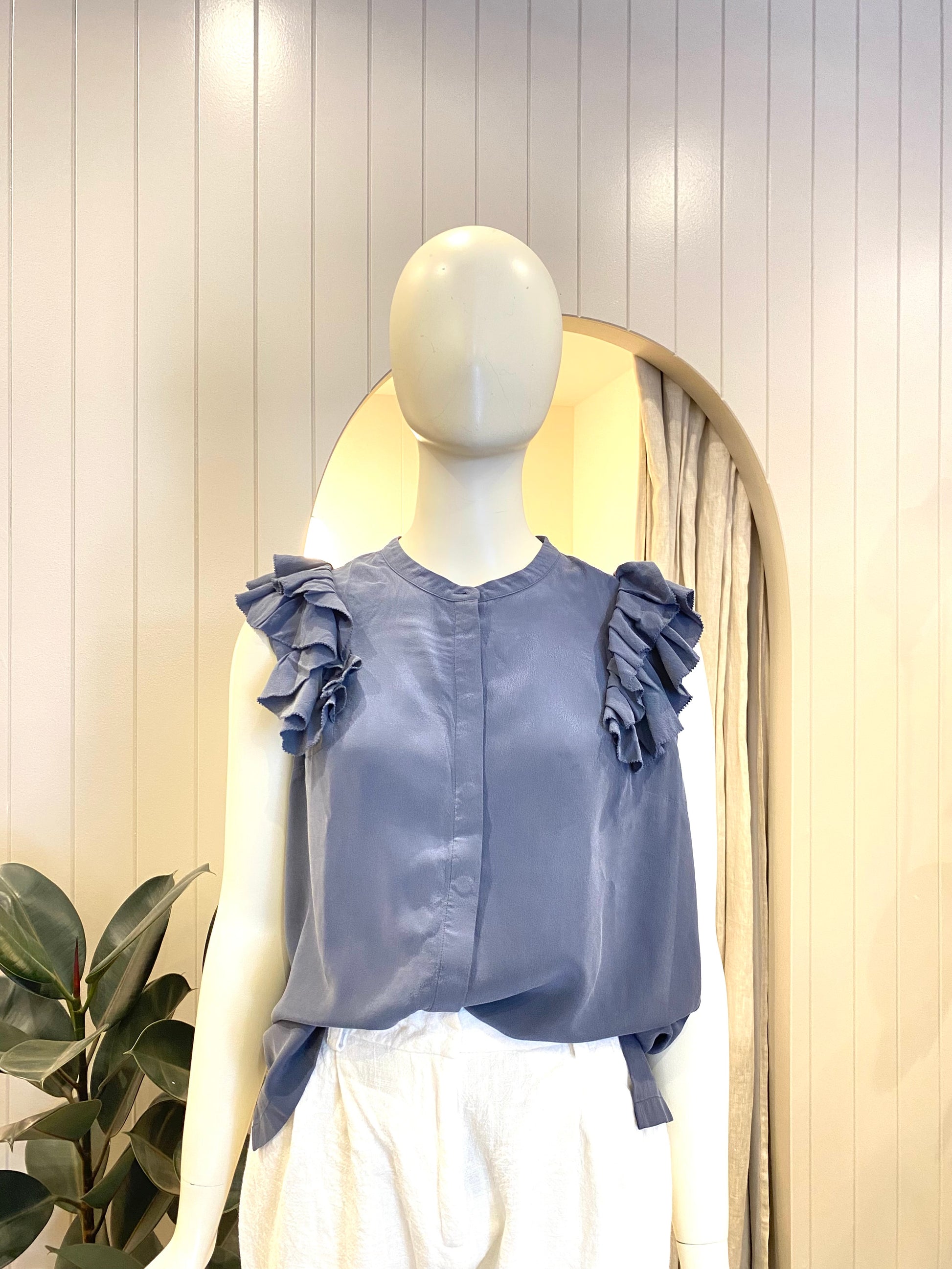 Description : Blue silk sleeveless blouse with frill collar and hidden buttons.