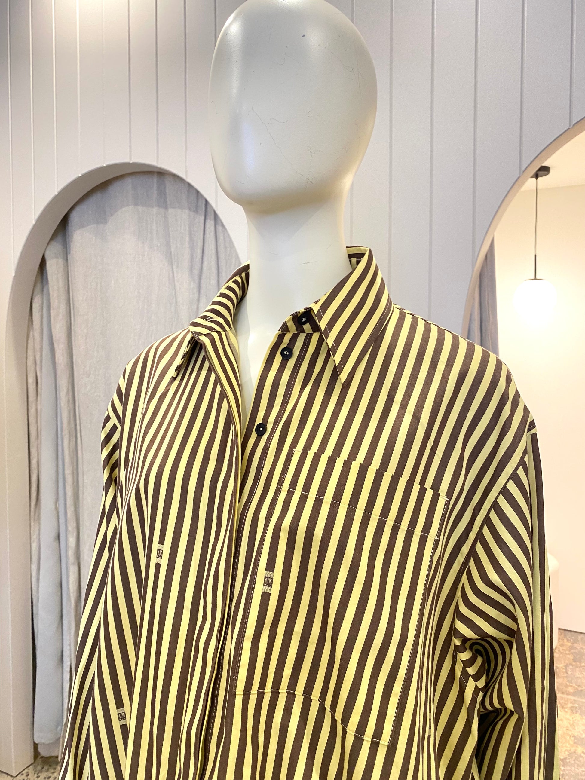 Description : - Relaxed oversized shirt - Monogram stripe jacquard - Classic collar - Dropped shoulders - Patch pocket with twin needle stitching - Concealed button placket with branded buttons - Neat cuff with contrast button on sleeve placket - Curved hem