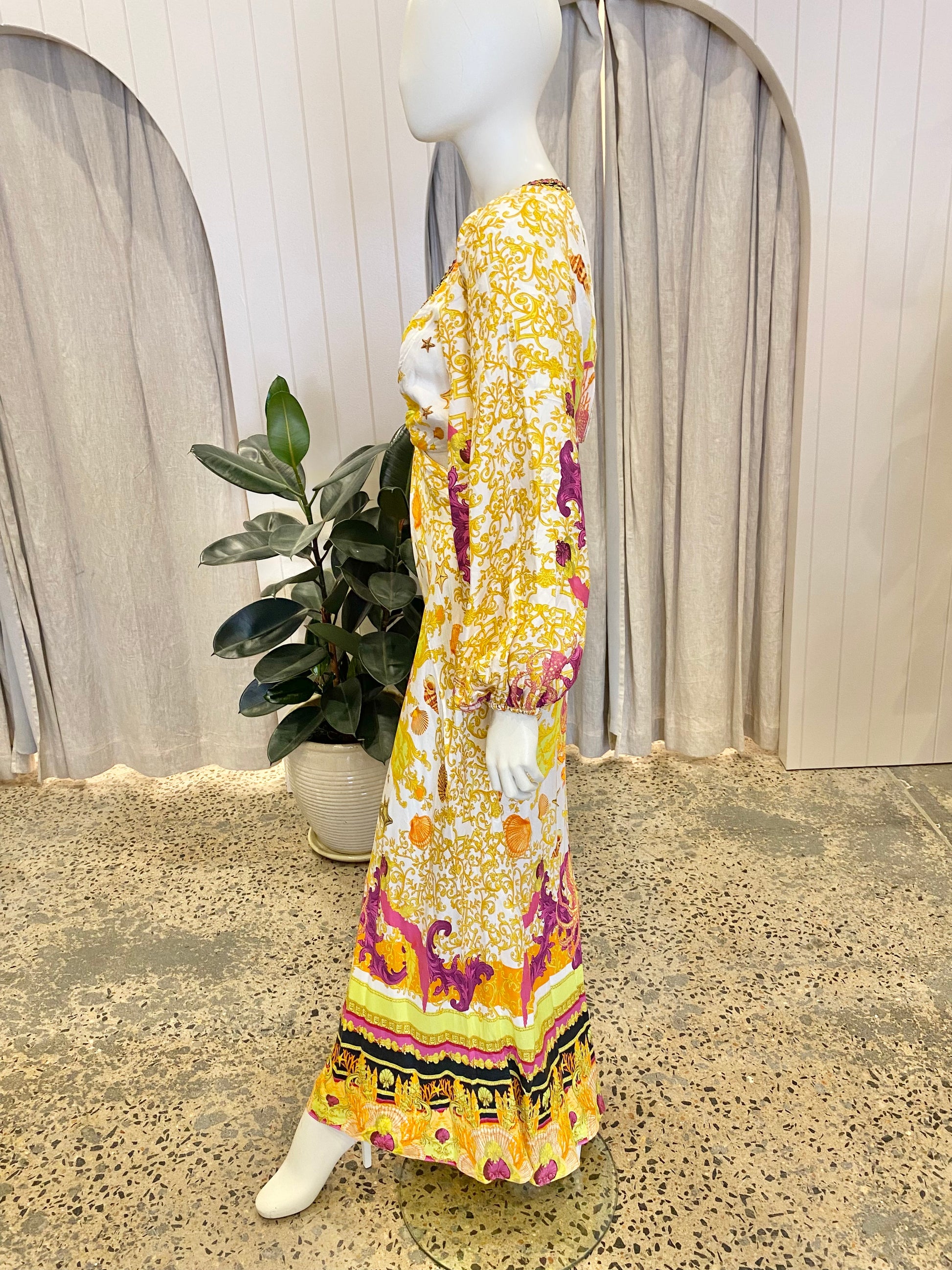 Description : Crafted from signature CAMILLA silk, this statement occasion dress features a billowy blouson sleeve, hand-embellished crystals, subtle cut-outs at the waistline, gold hardware detailing and a relaxed maxi silhouette.