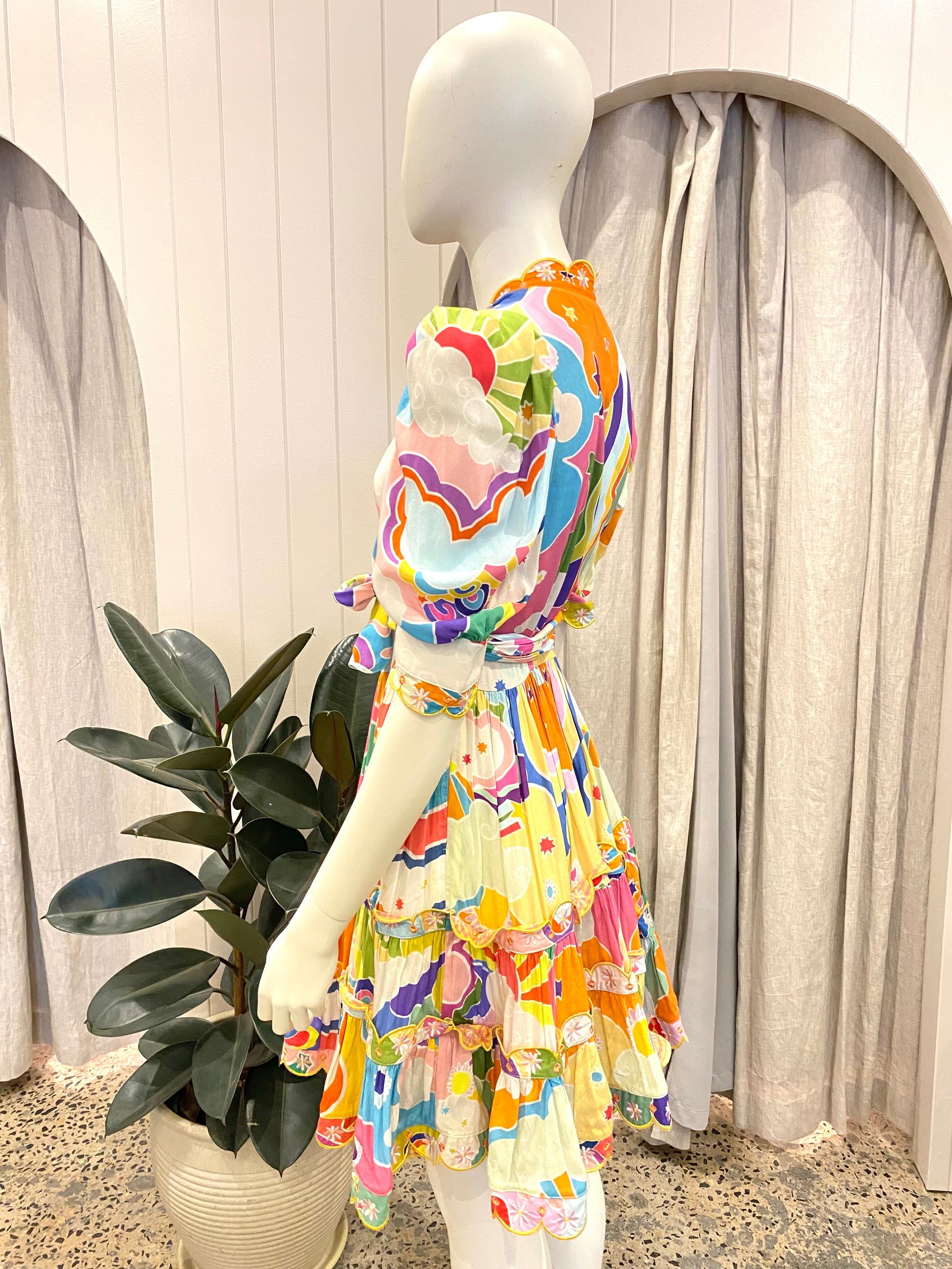 Description : This beautiful, bright and fun Celia B mini dress is a gorgeous wrap like style with a tie that can be tied at the front, back or side. Gorgeous scalloped neckline, sleeves and hem.