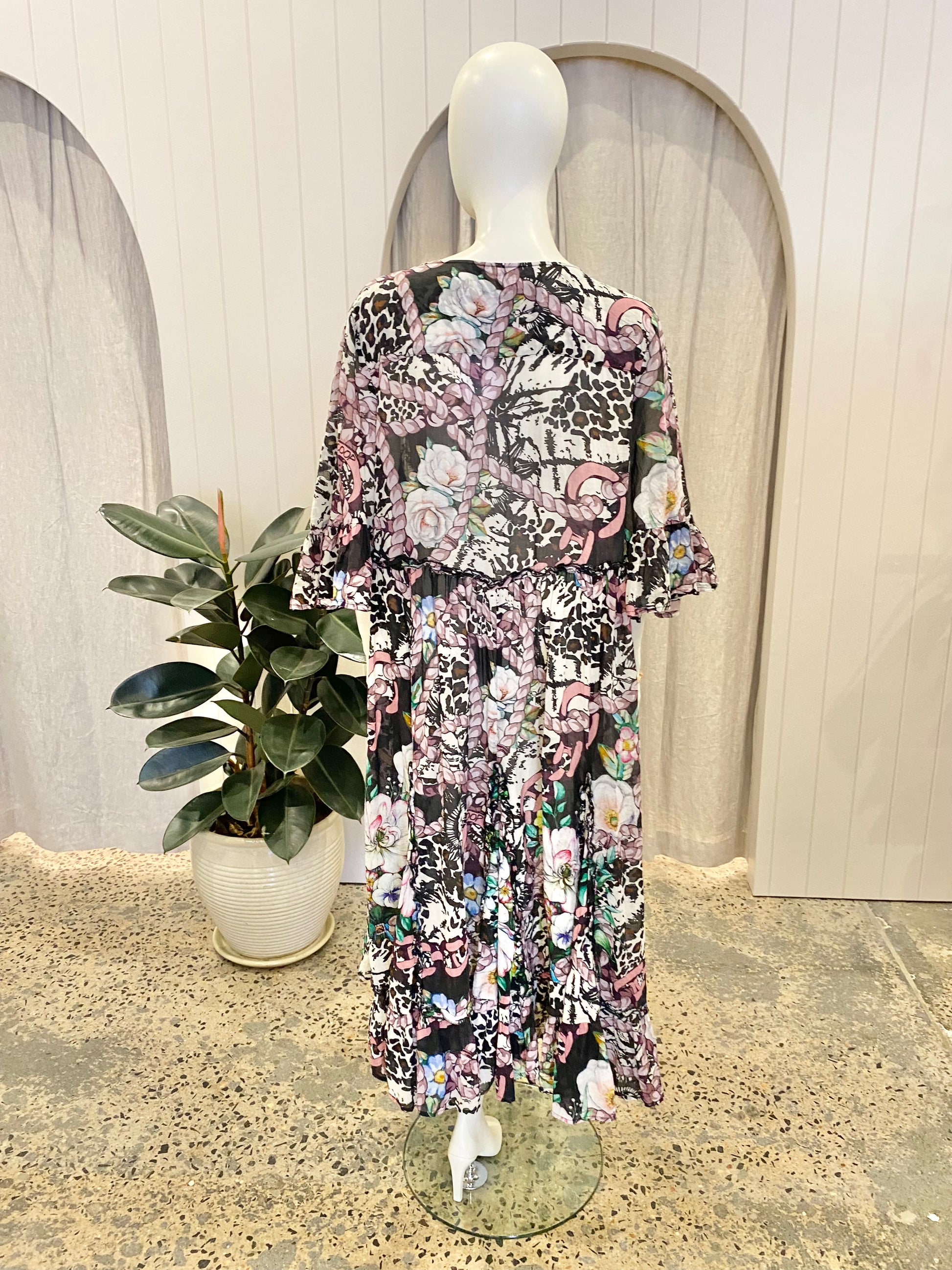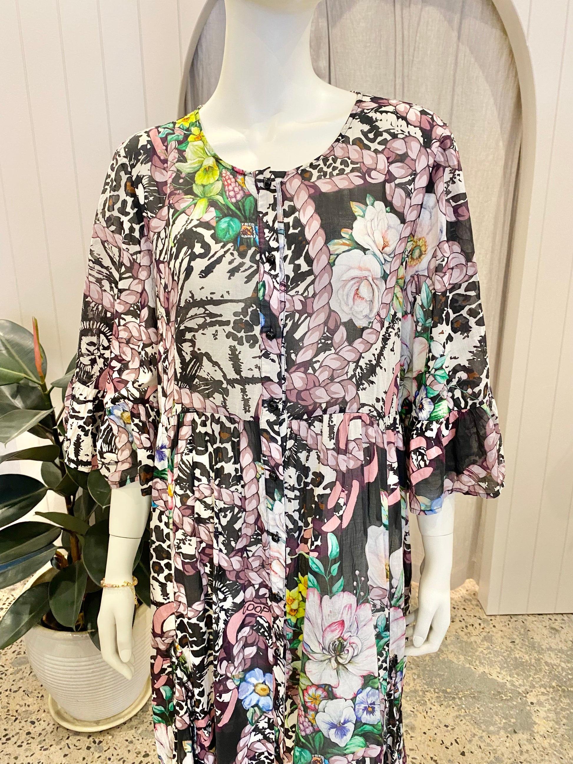 Description : floral print wide round neckline 3/4 sleeves front button down