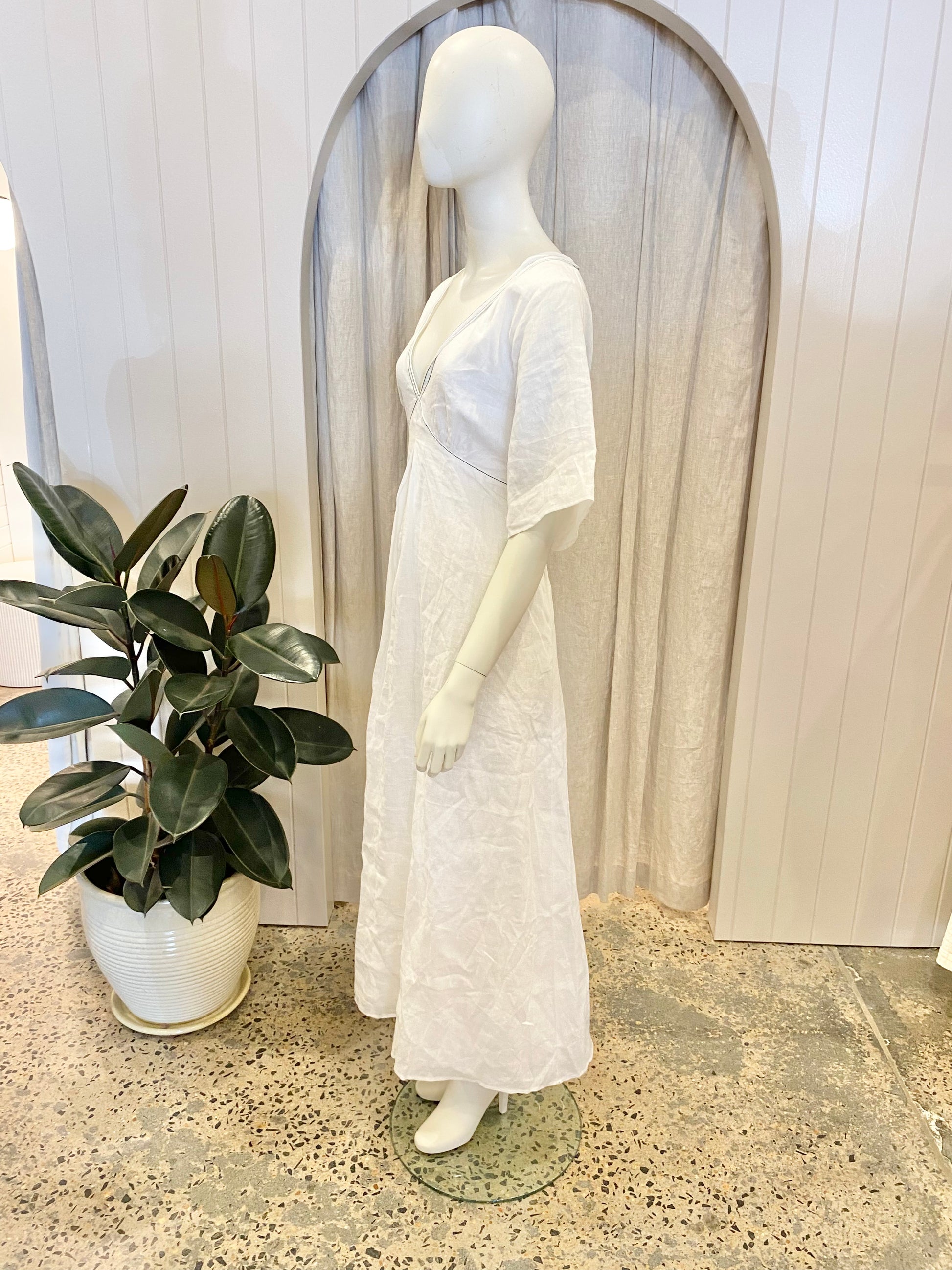 Description : - Short sleeved midi dress - Low V neckline with contrast top stitching - Gathered under bust with box pleat at centre front - A line skirt