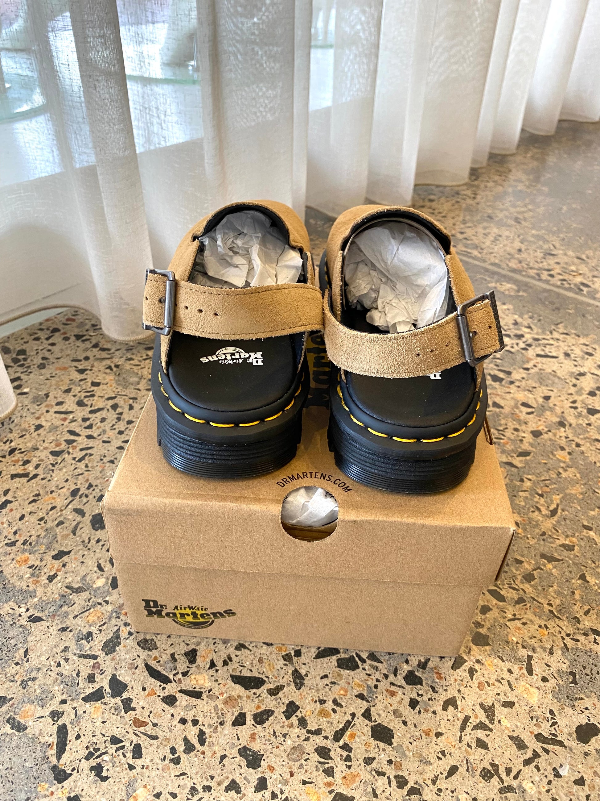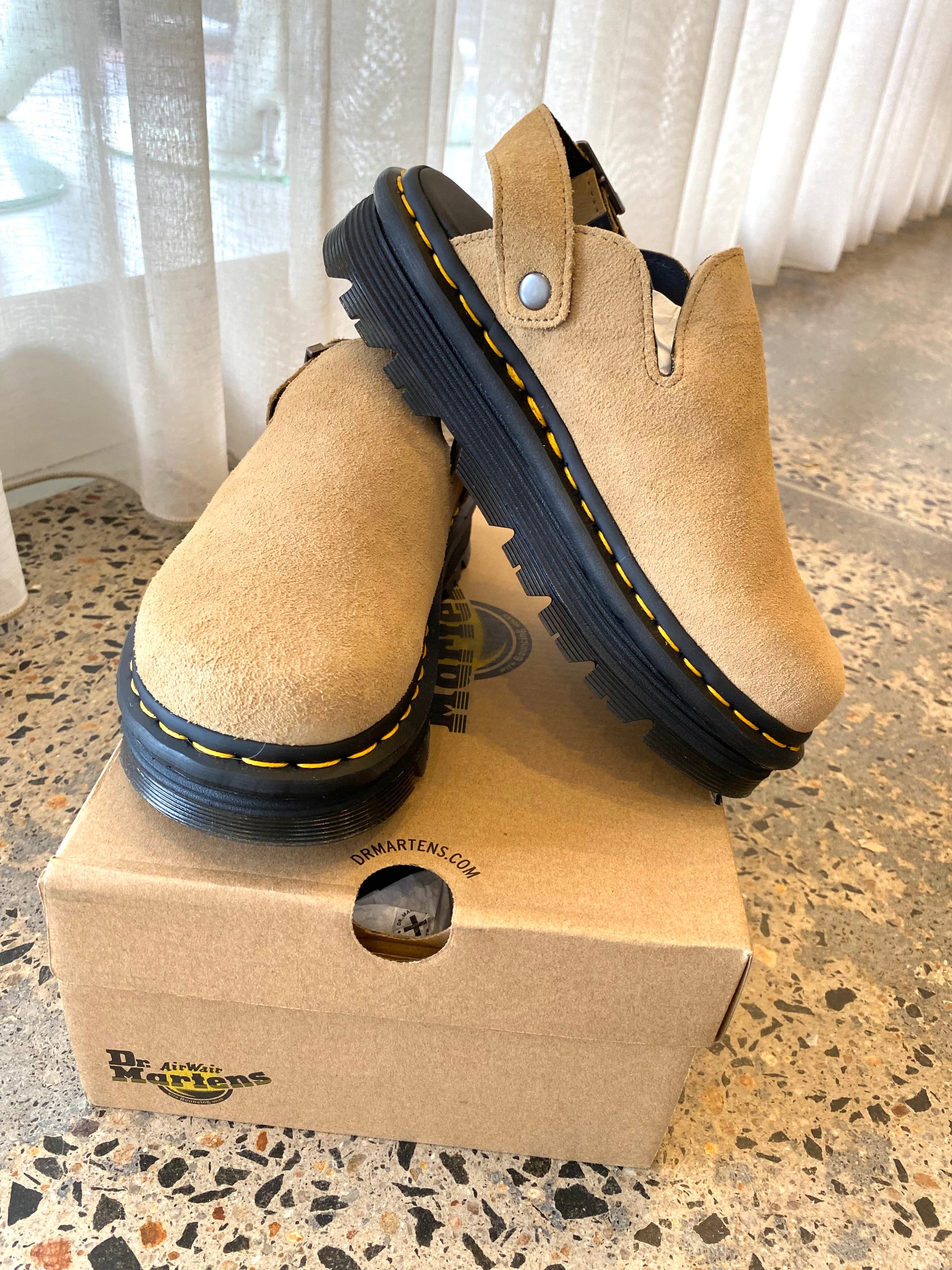 Description : Built on a hybrid air-cushioned sole that fuses feather-weight EVA with rugged PVC. Crafted from lightweight, versatile suede, they’re designed to be worn however you feel like – in summer or out of the conventional season. The adjustable strap ensures a secure fit, while the welted construction delivers signature durability. Yellow welt stitching marks the mules as Dr. Martens.
