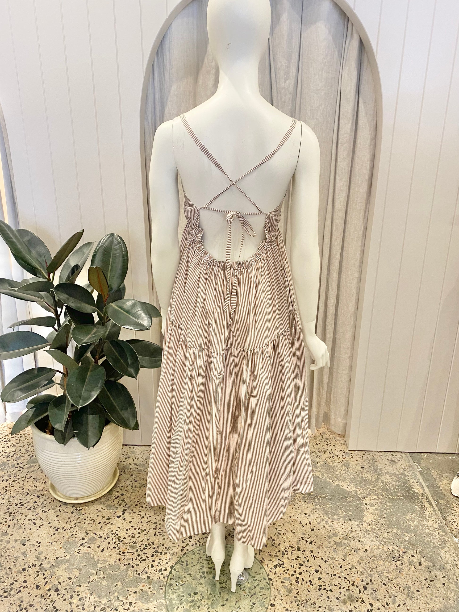 Description : - Apron style midi dress - Crossed back straps - Tiered skirt - Side seam pockets - Tan & white stripe.
