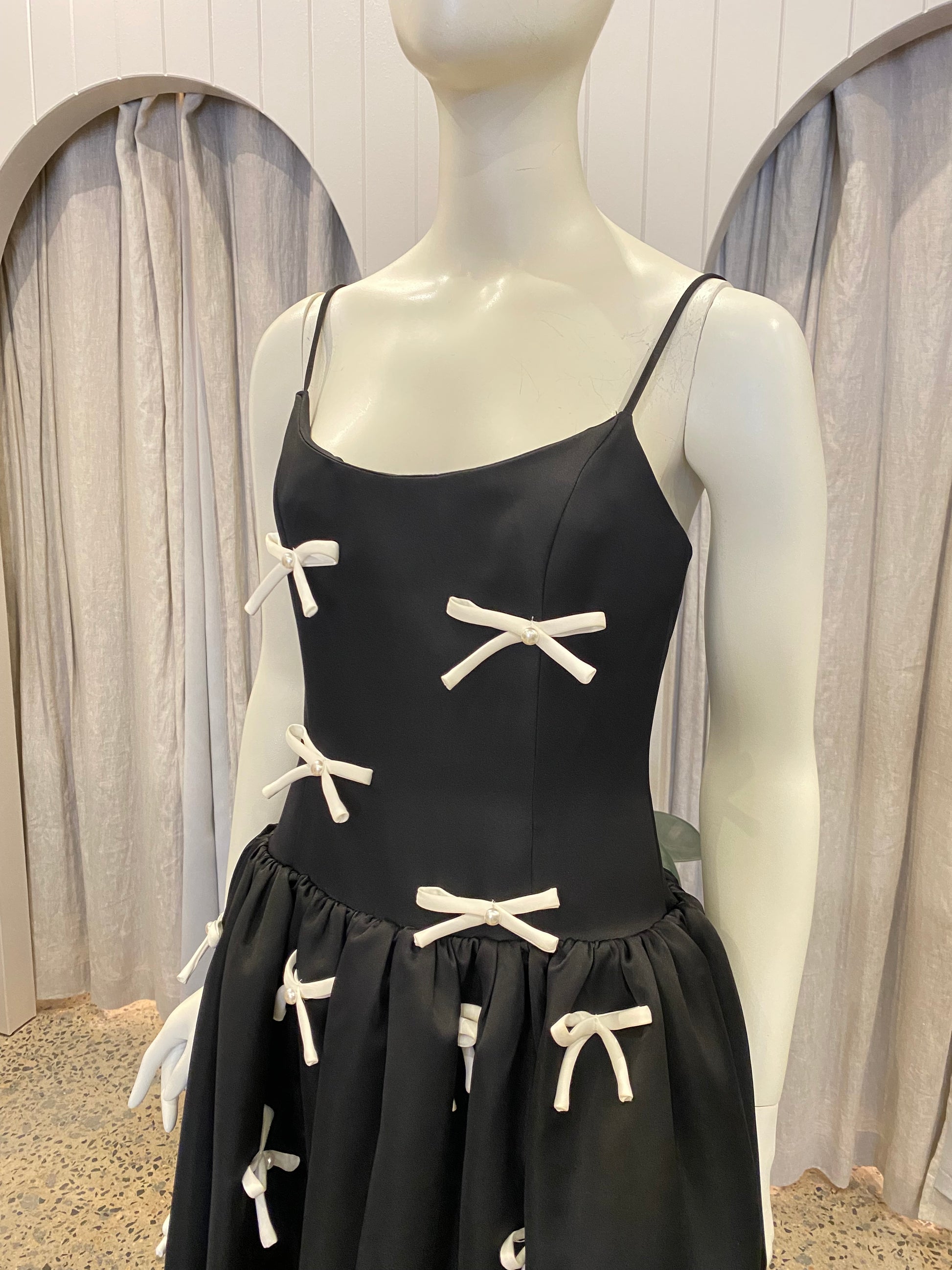 Description : - A-line midi dress in duchess satin- Curved neckline with adjustable straps - Gathered skirt at waist seam for volume - Fit and flare silhouette - 3D bows with pearl embellishment - Invisible centre back zipper - Fully lined for structure and comfort - Fabric has no stretch