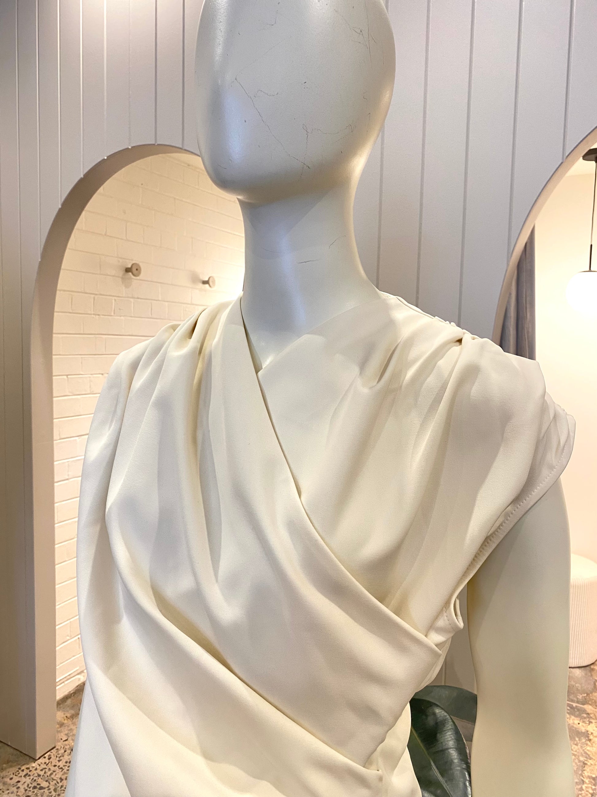 Description : cream wrap top, high v neckline, ruched short sleeves, fitted bodice, key hole back