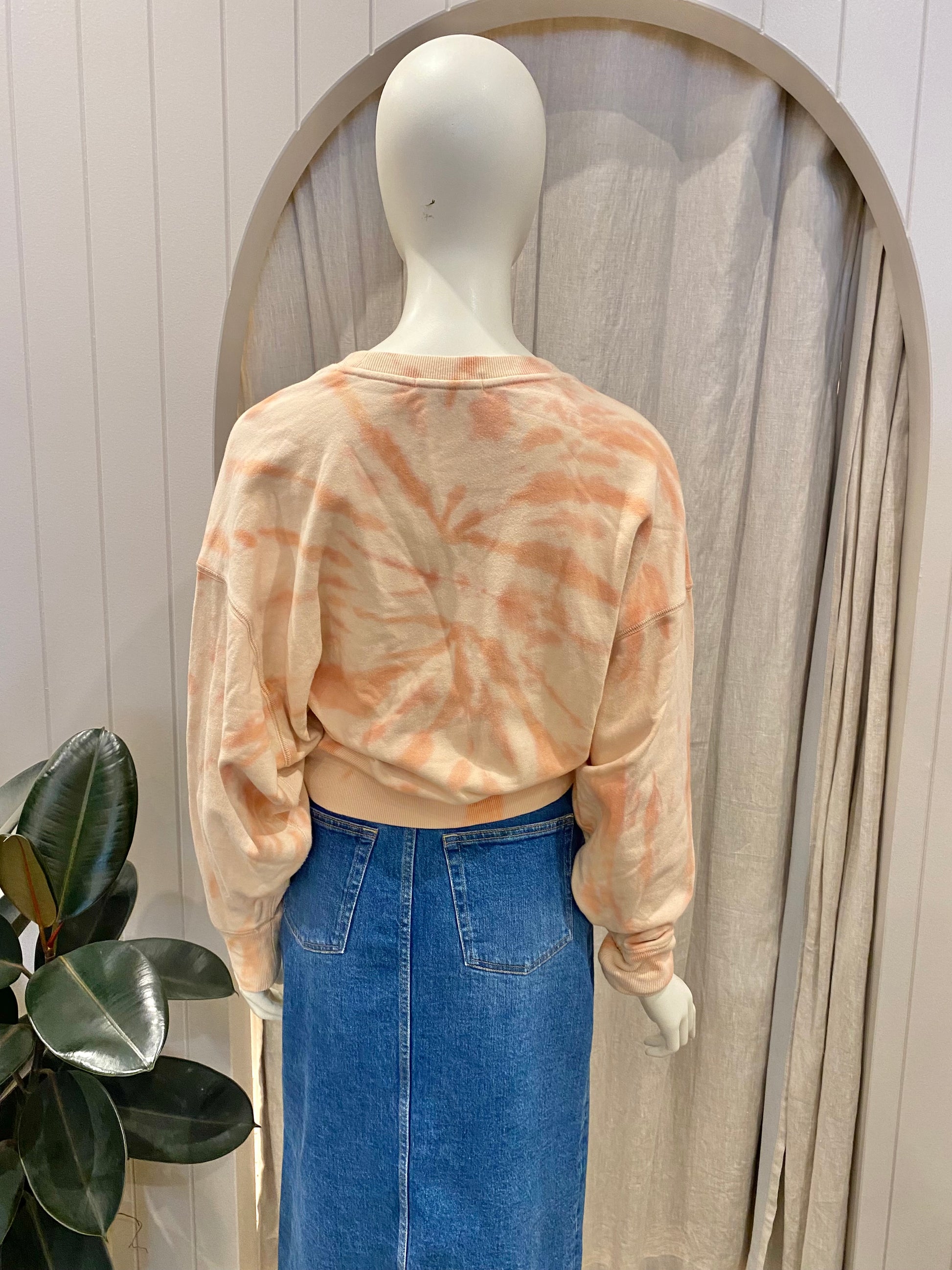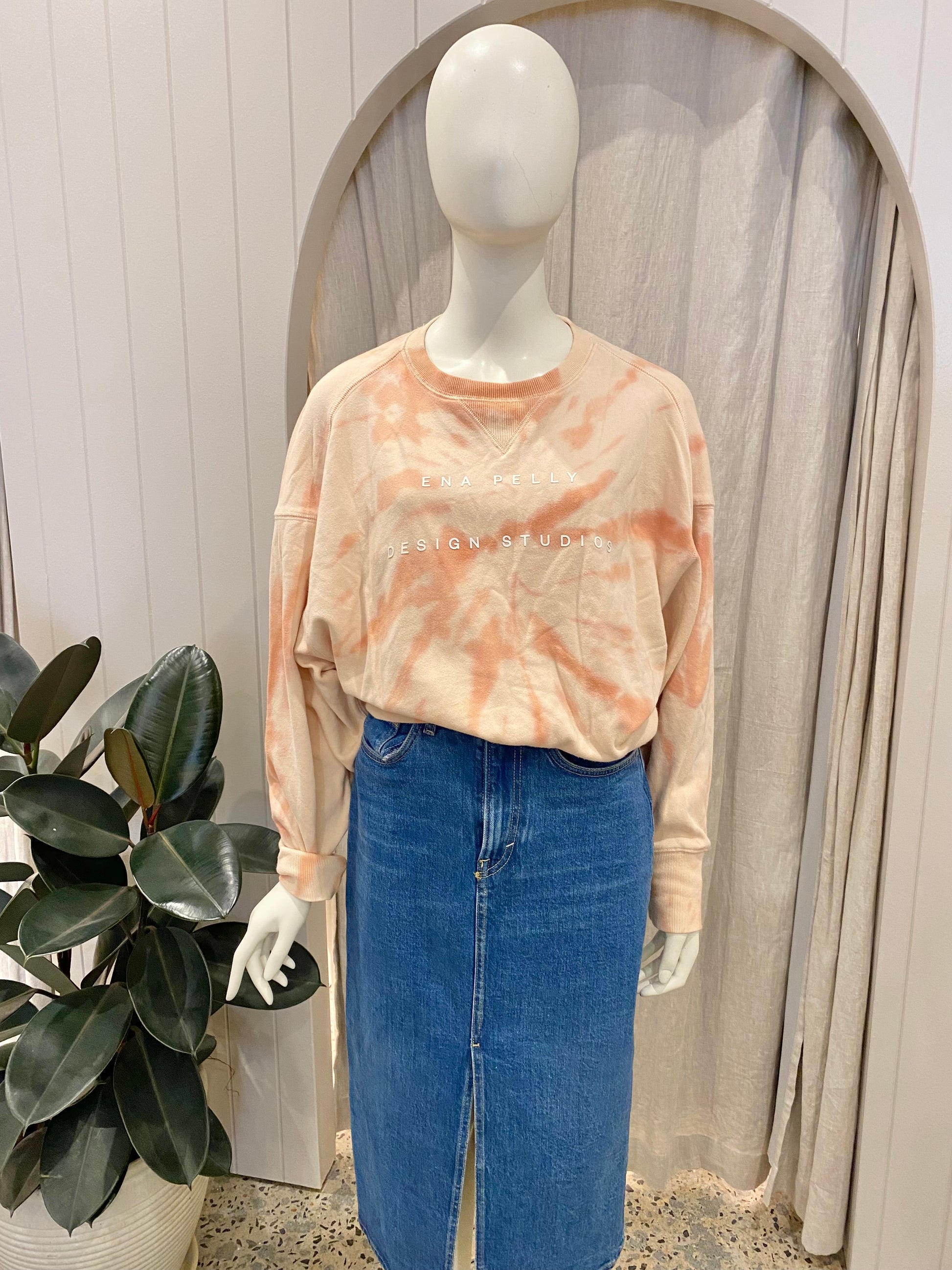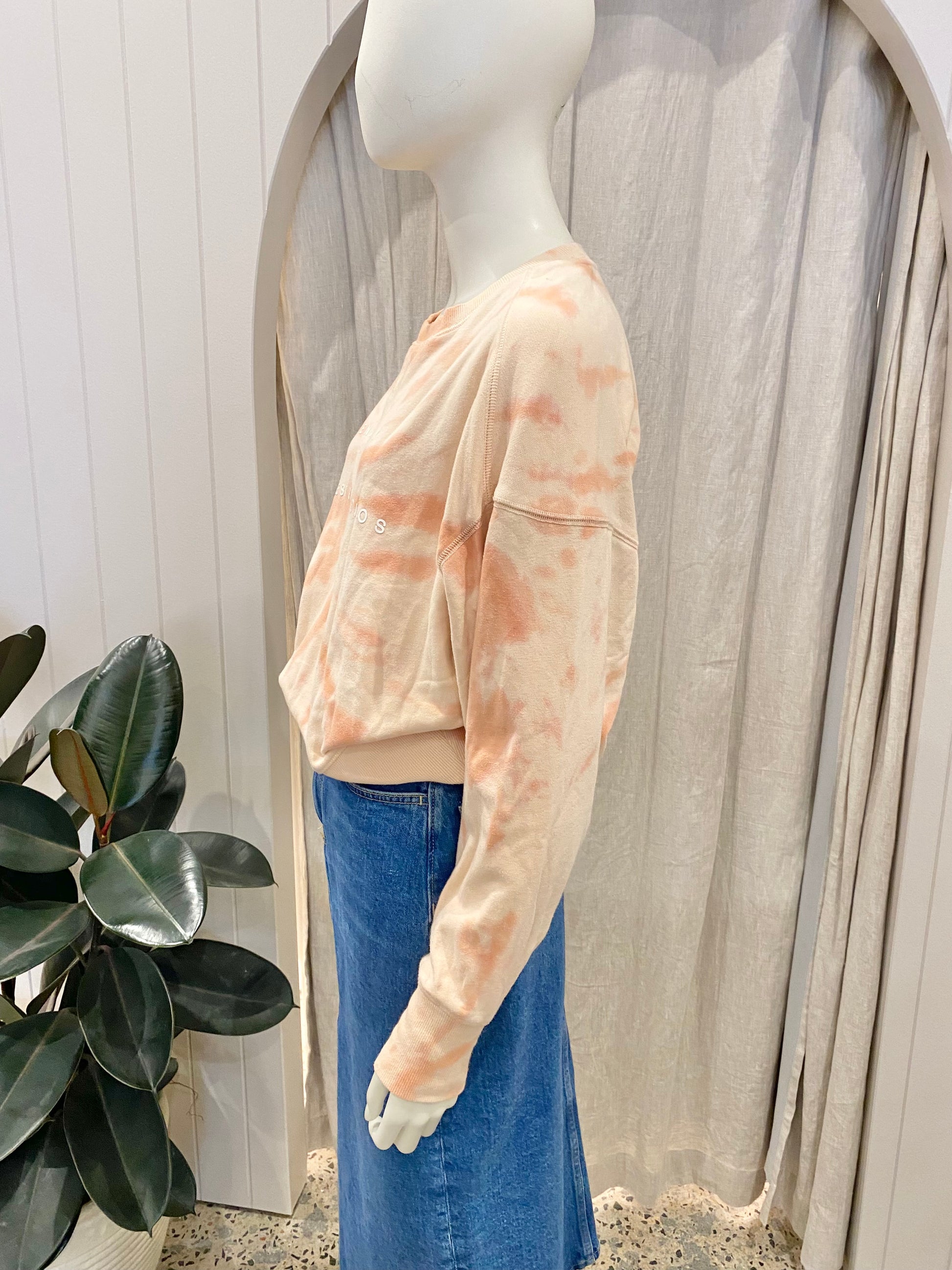 Description : Apricot tie dye sweater, ribbed crewneck, ribbed cuffs, wide ribbed hem, Ena Pelly logo on front.