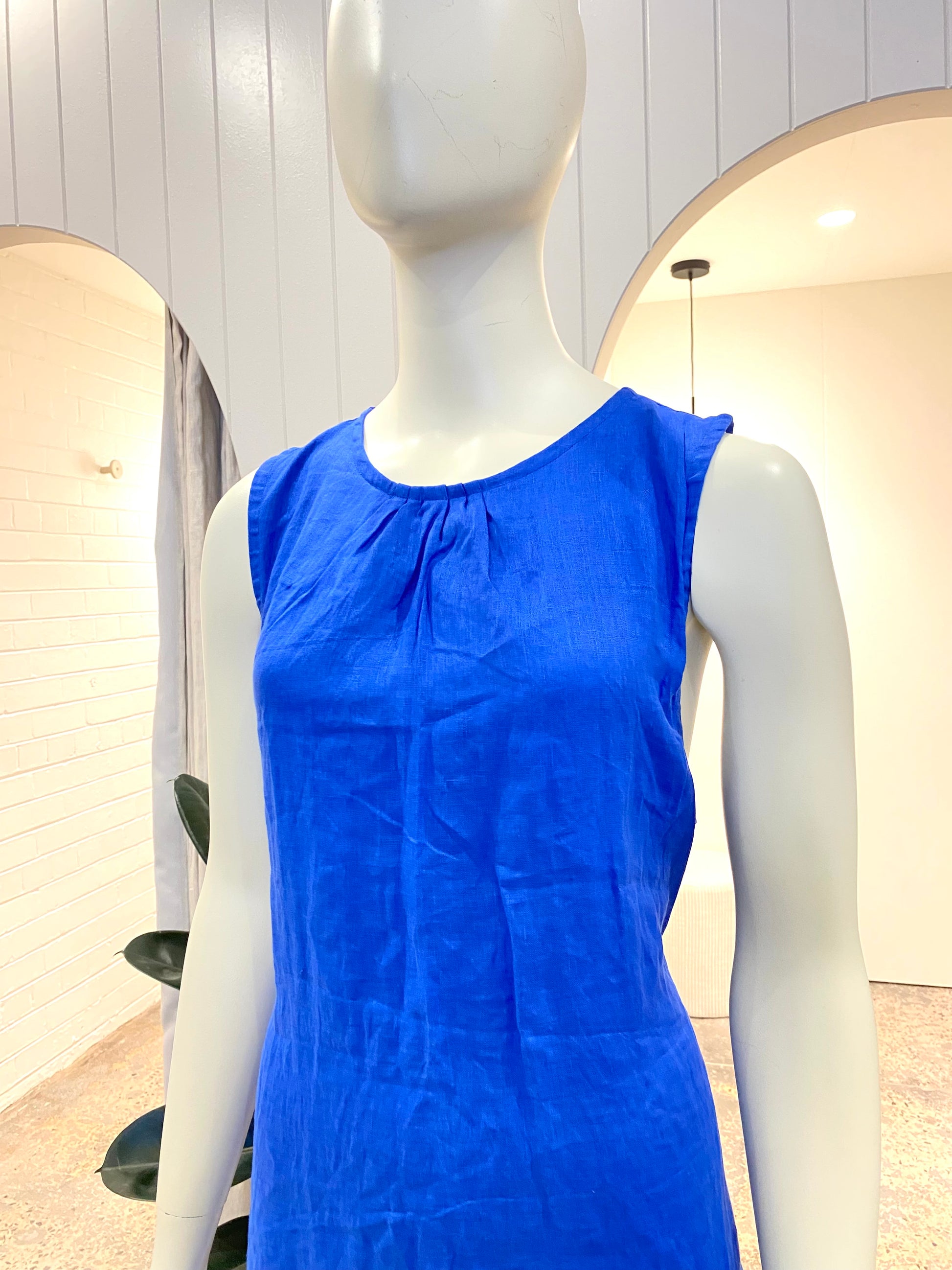 Description : An effortless vacation essential that you can wear at the beach and for dinner afterwards. Made from linen in a figure-skimming shape, high round neckline with tie up at the back, side seam pockets and an open back.