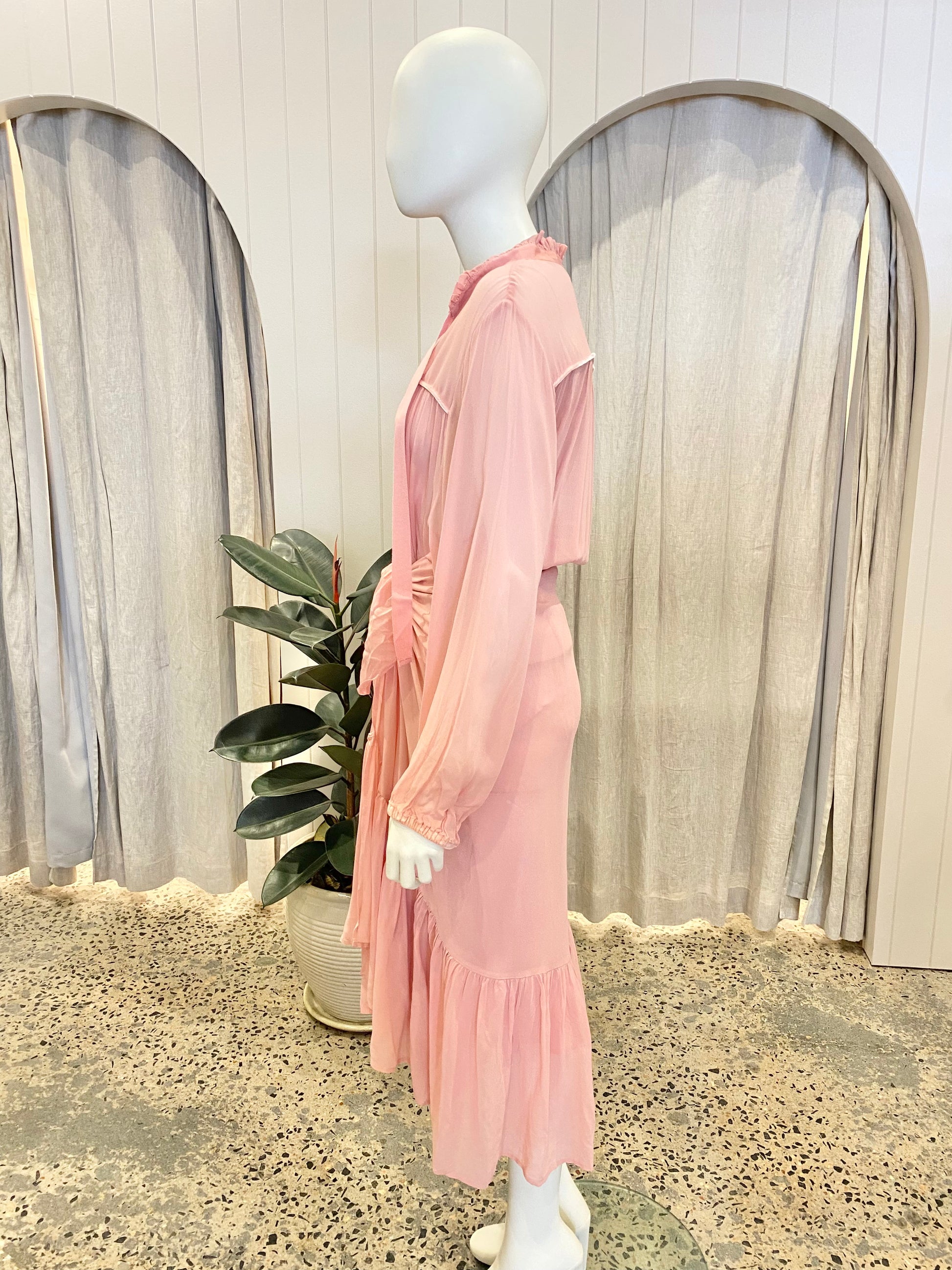 Description : - Floaty sheer viscose chiffon fabrication - Long sleeve with contrast velvet elastic cuff - Neck tie - High frill collar - Tie front skirt - Maxi length