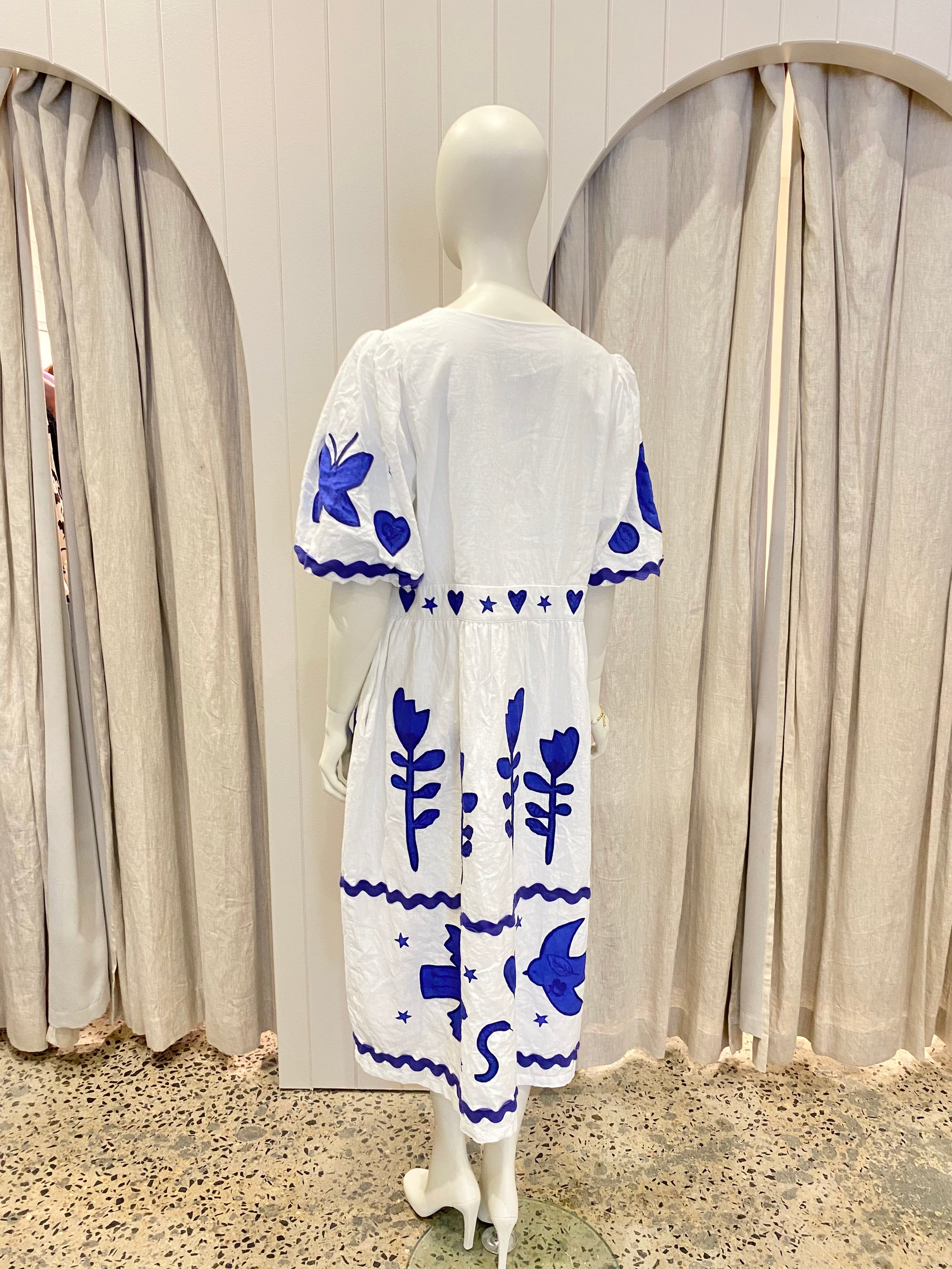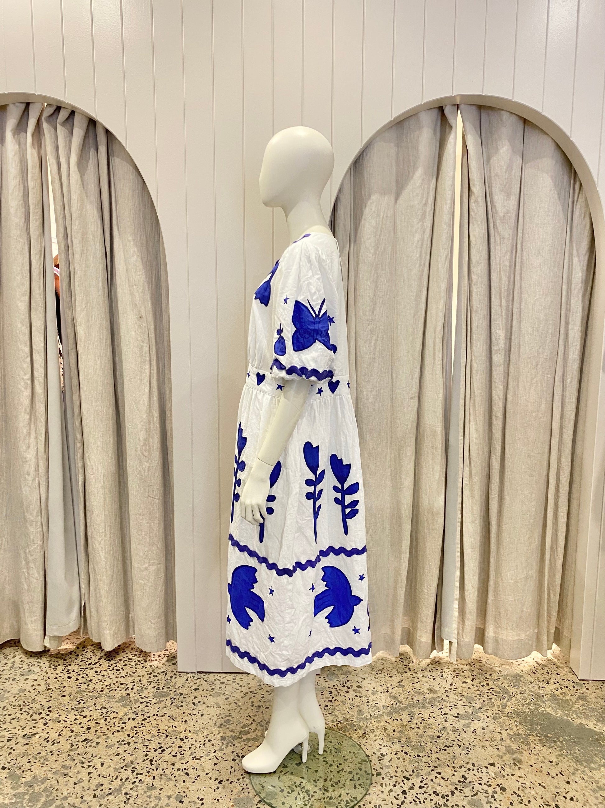 Description : The Gorman Lovebirds Embroidered Dress is a whimsical, limited-edition midi dress known for its artisanal feel, it features intricate bird and floral embroidery that serves as the "star of the show". Design Details: The dress is characterized by short puff sleeves and delicate ric rac applique detailing. It often features a vibrant blue and white colour palette with embroidered bird motifs scattered across the fabric. Side seam pockets and a v neckline give a feminine finish