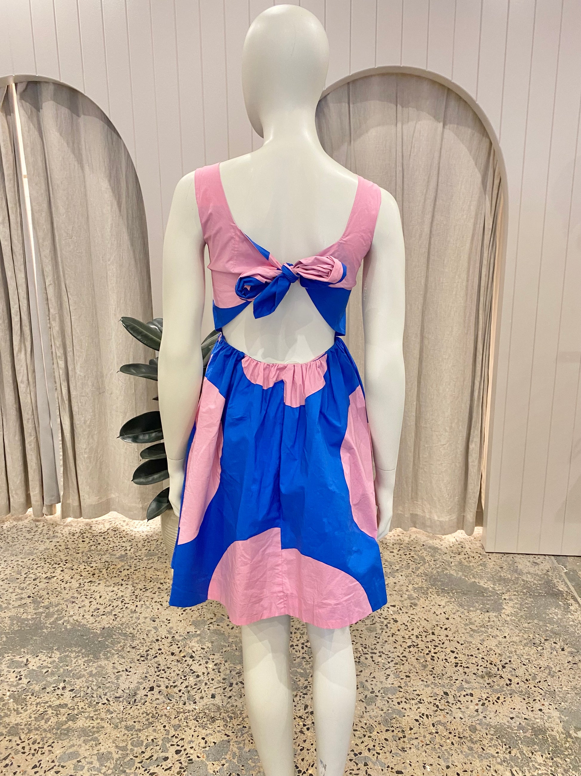Description : blue and pink mini dress, sleeveless, open back with a tie, fully lined