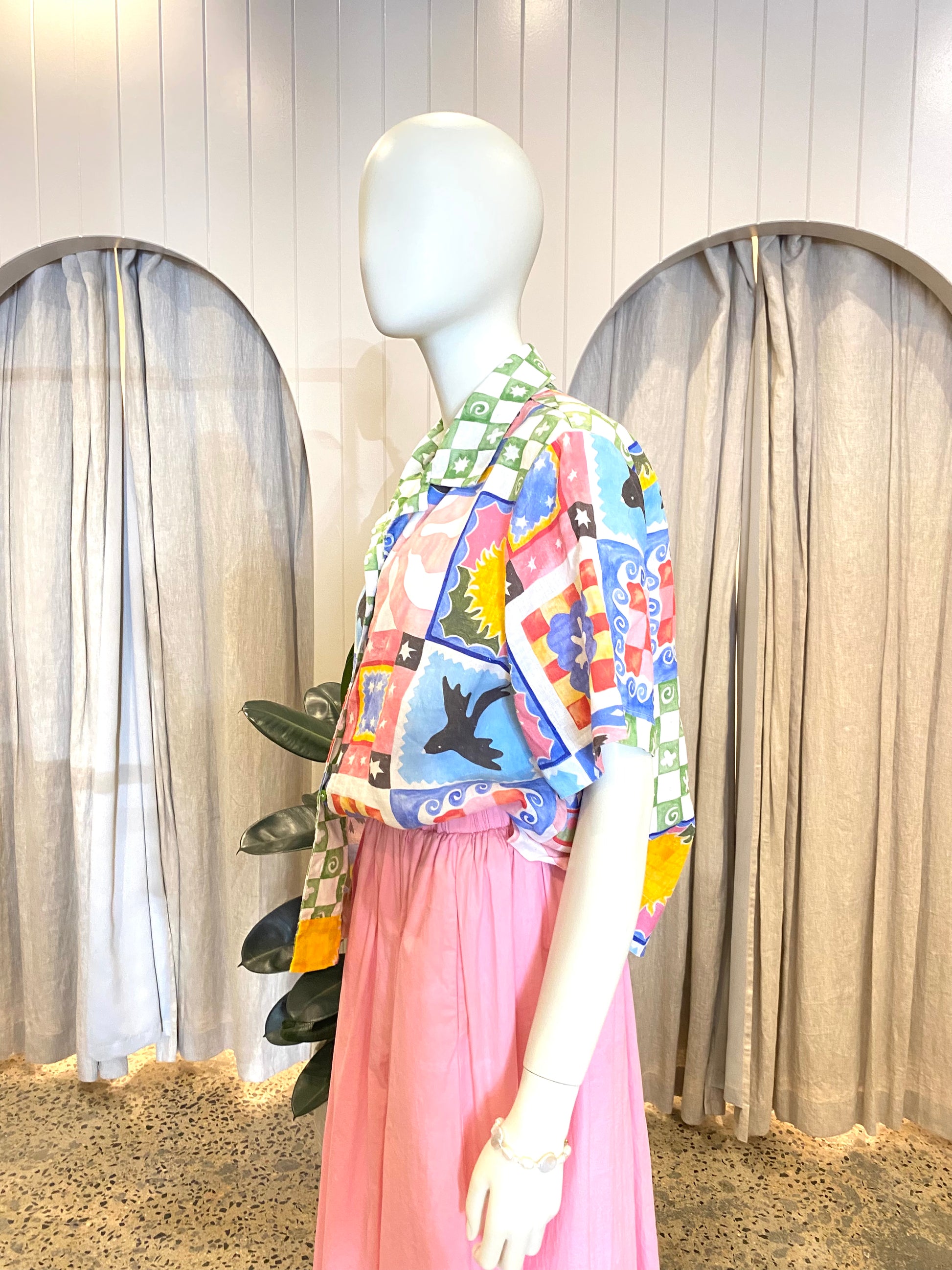 Description : - Linen blend fabrication - Notched shirt collar shaping and centre front button opening - Short sleeves - Loose, relaxed fit - Finishes at hips - Features exclusive Gorman artwork - Print placement varies per individual garment