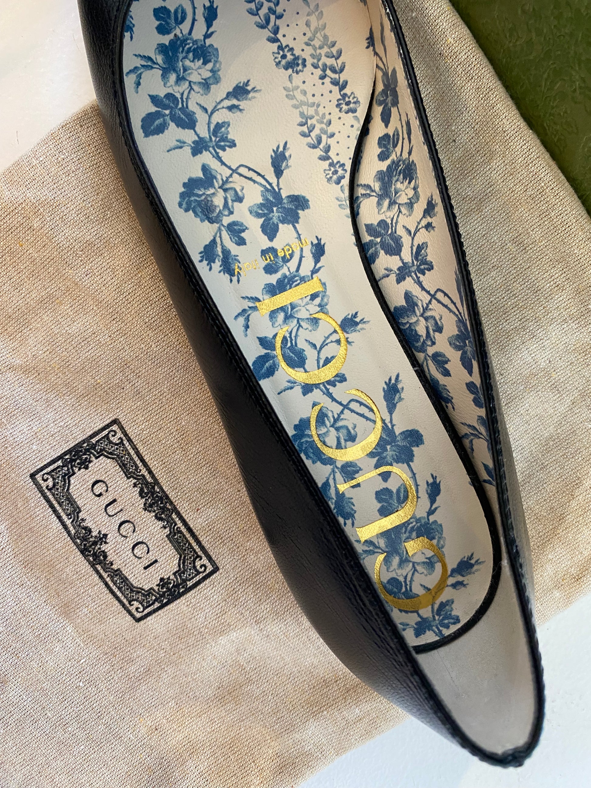Description : Black leather upper, slip on style, double g GG perforated toe, floral lining, sold with box & disbars. .