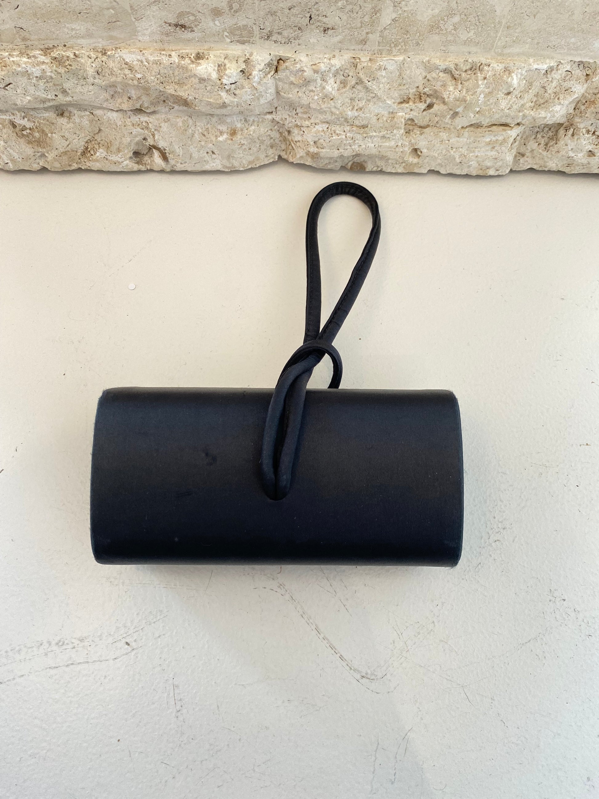 Description : Satin black satin cutch with gold gucci name plate and satin handle.