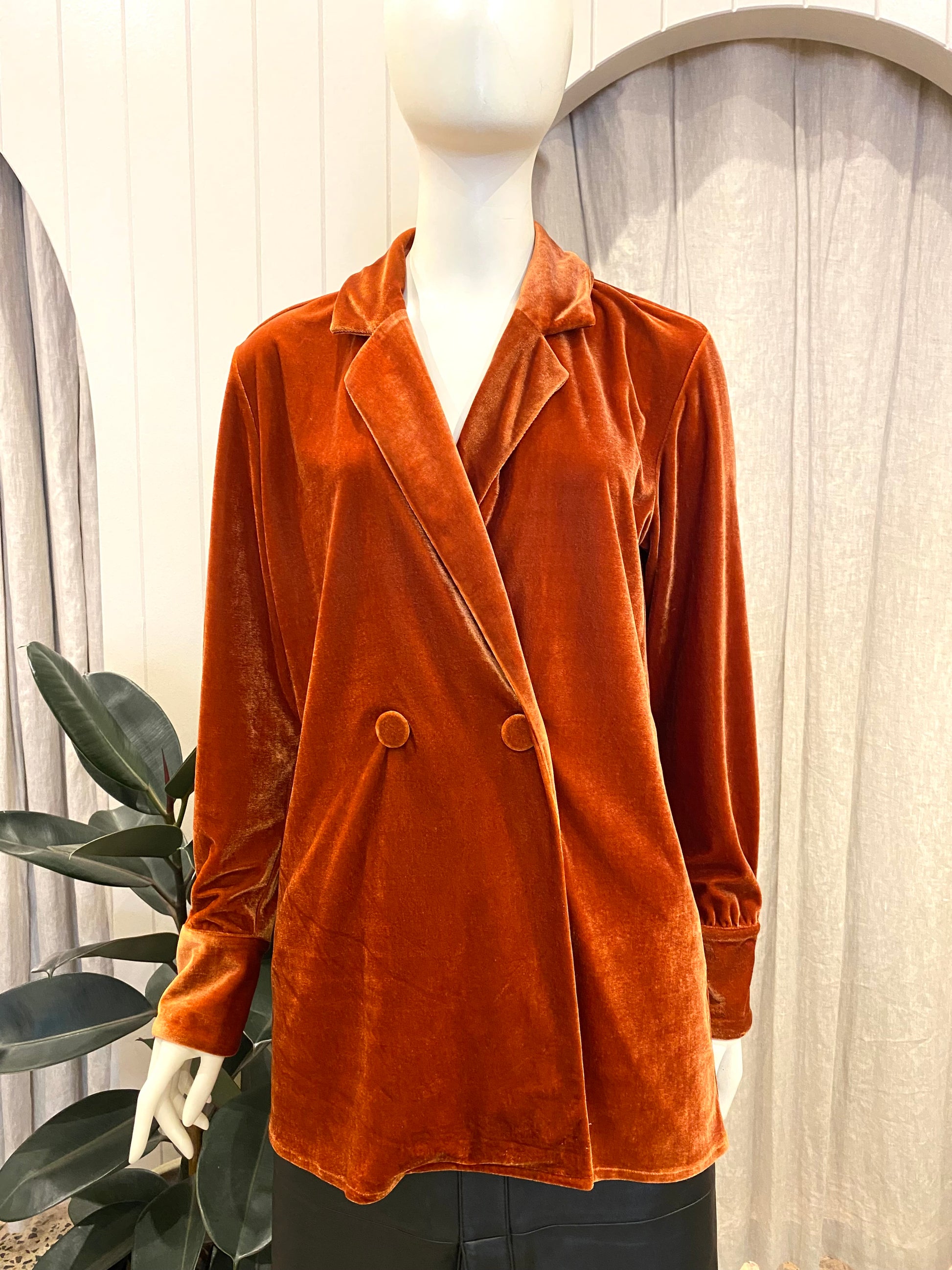 Description : - Oversize double breasted blazer - Self covered round buttons - Fully lined - Soft velvet fabrication, not sheer - Branded Hansen coat chain