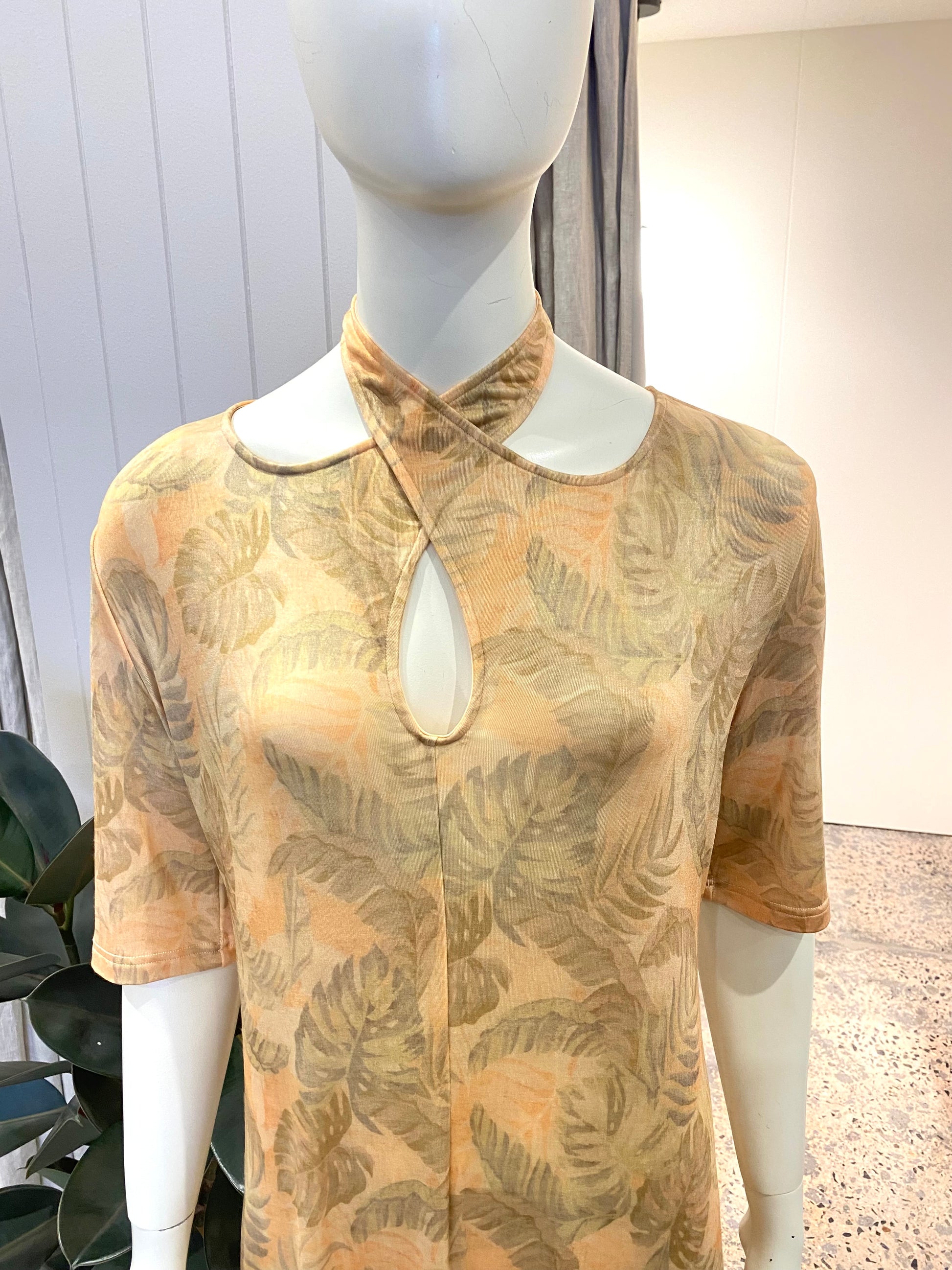Description : - A cut-out halter neckline - Stretch midi dress, - Muted palm tree print. - Short sleeves - Self-tie halter straps - Pullover style - Removable tie at waist - Side slits