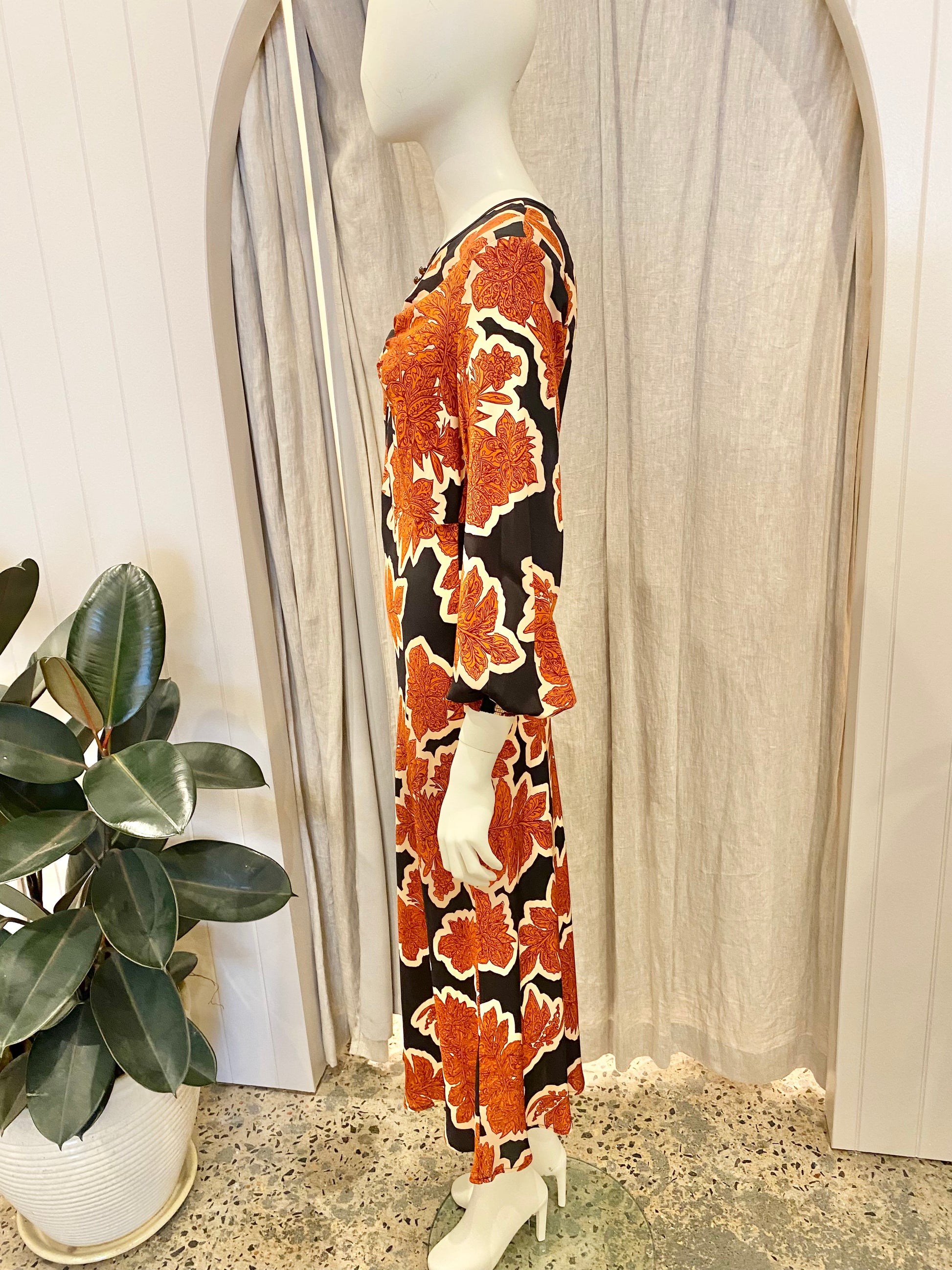 Description : rust and black floral midi dress, invisible back zip closure, ruched keyhole on front, long sleeves with elasticated cuffs