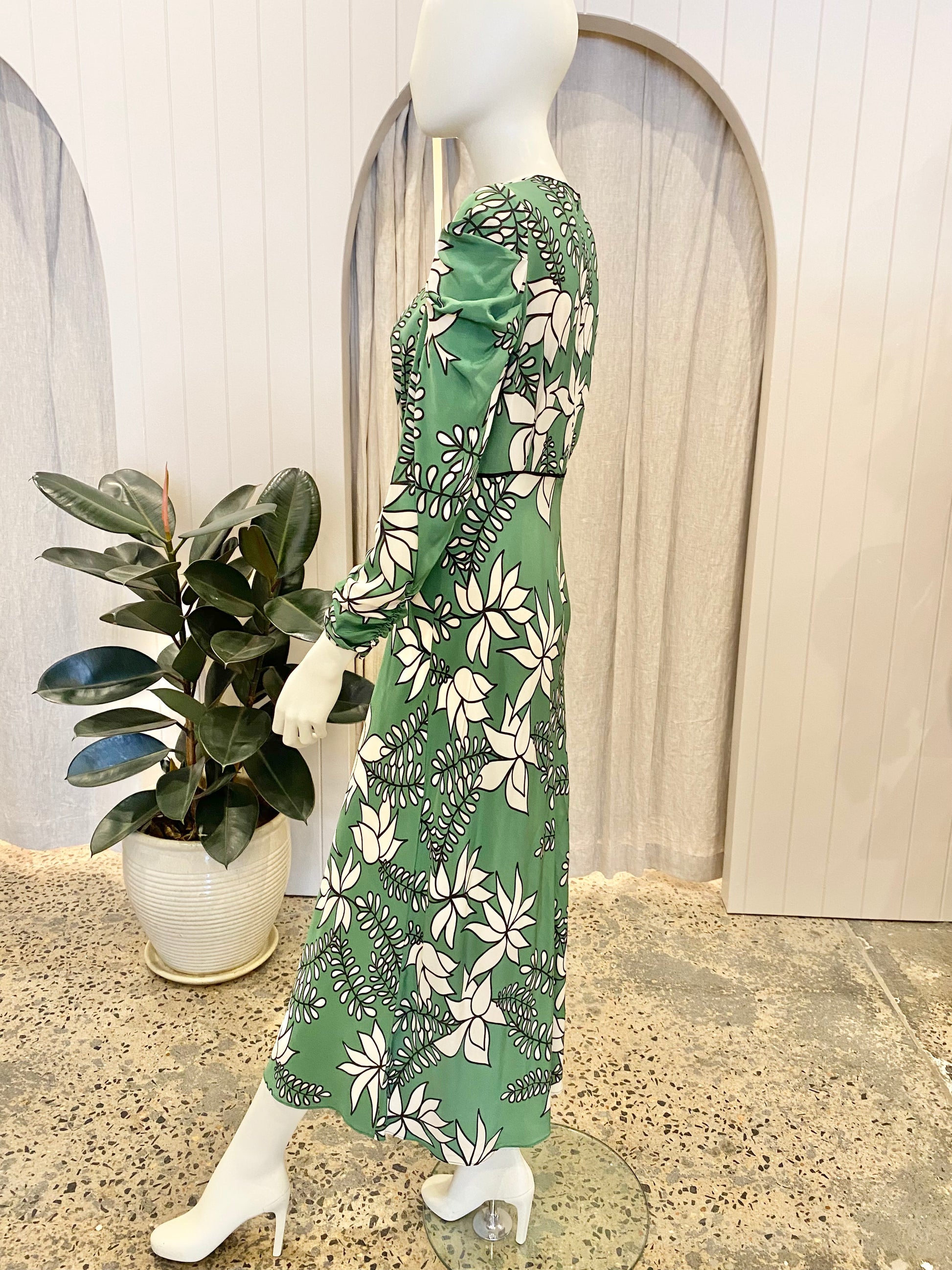 Husk Silk Dress in Green/White Leaf Print- Size 12