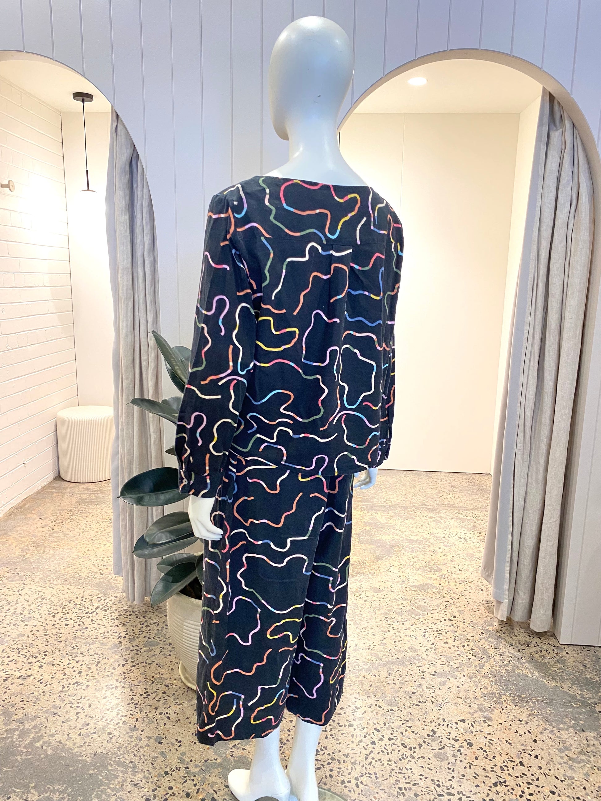 Description : Black linen/cotton blend pants and top set, featuring pockets and an elasticated waist band.