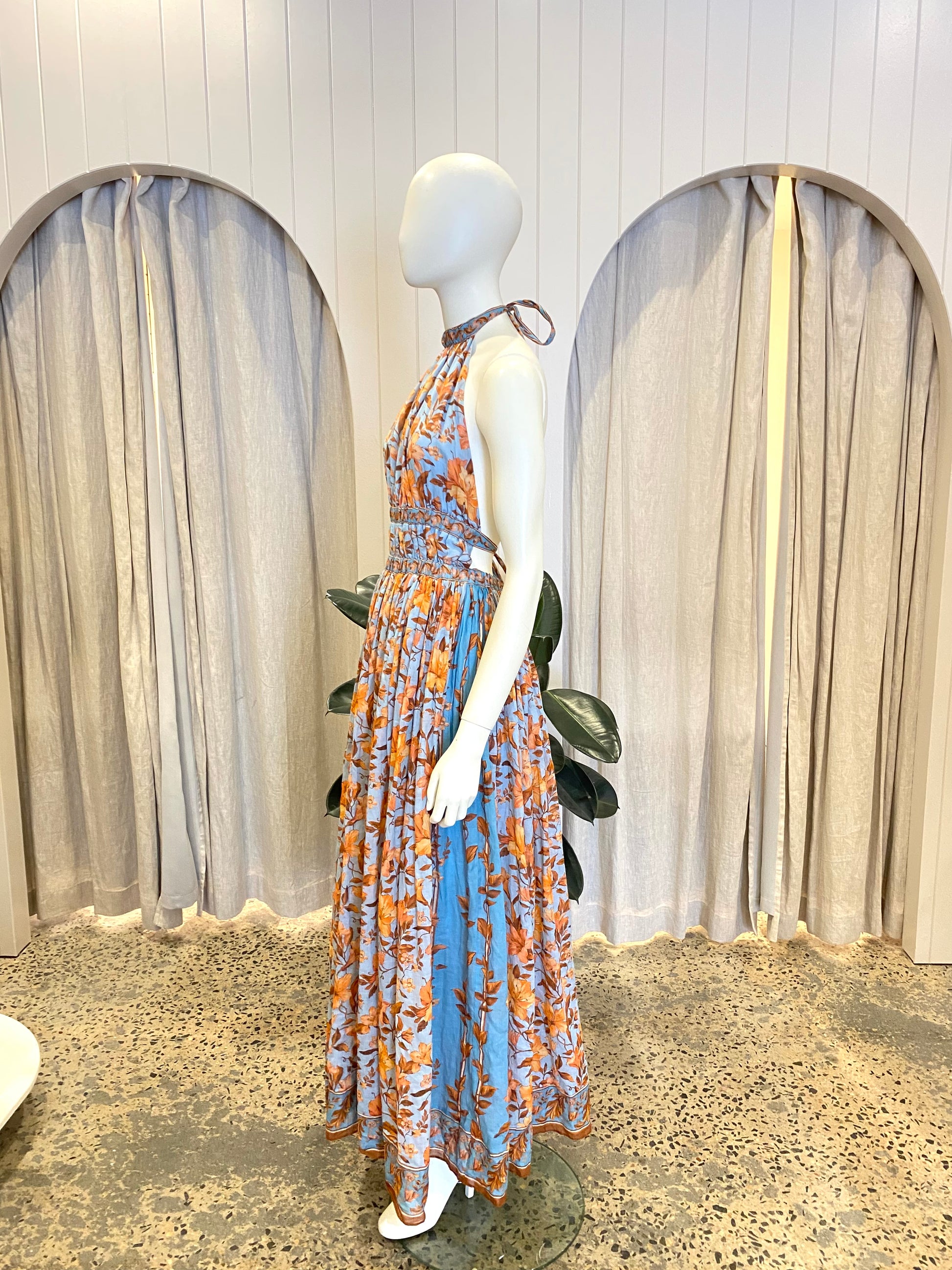 Description : The Azalea High-Neck Gown in Blue Bell, a Kate Ford exclusive placement hand-drawn print from our Spring Summer 2022 Collection, Love Lost. A Ramie long gown featuring a high neck tie with a flattering open back also with a tie to pull in your elasticated waist with a long flattering circle draped skirt.