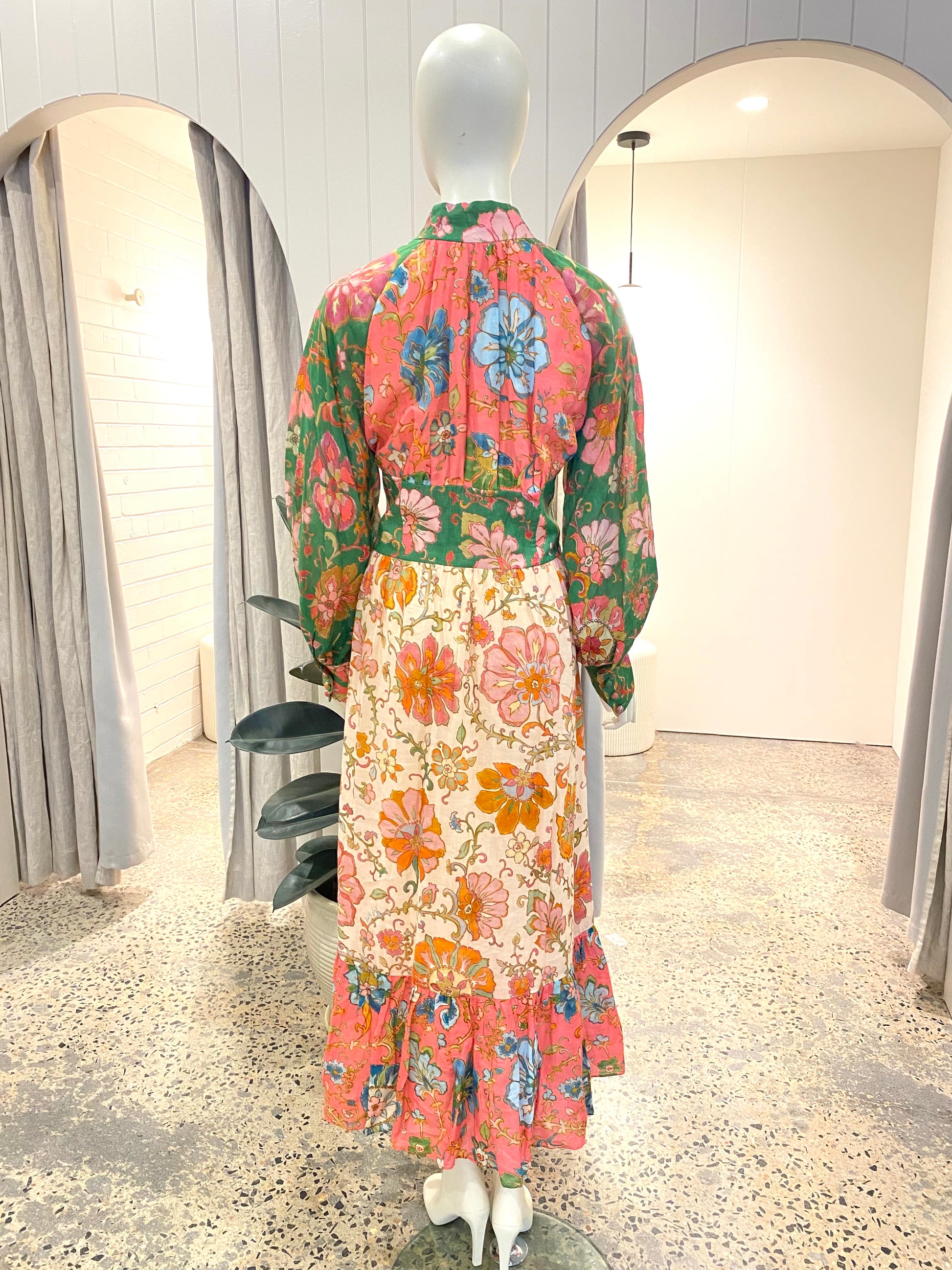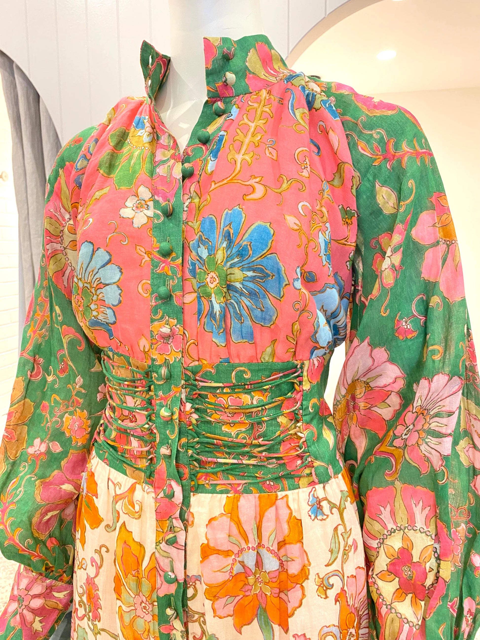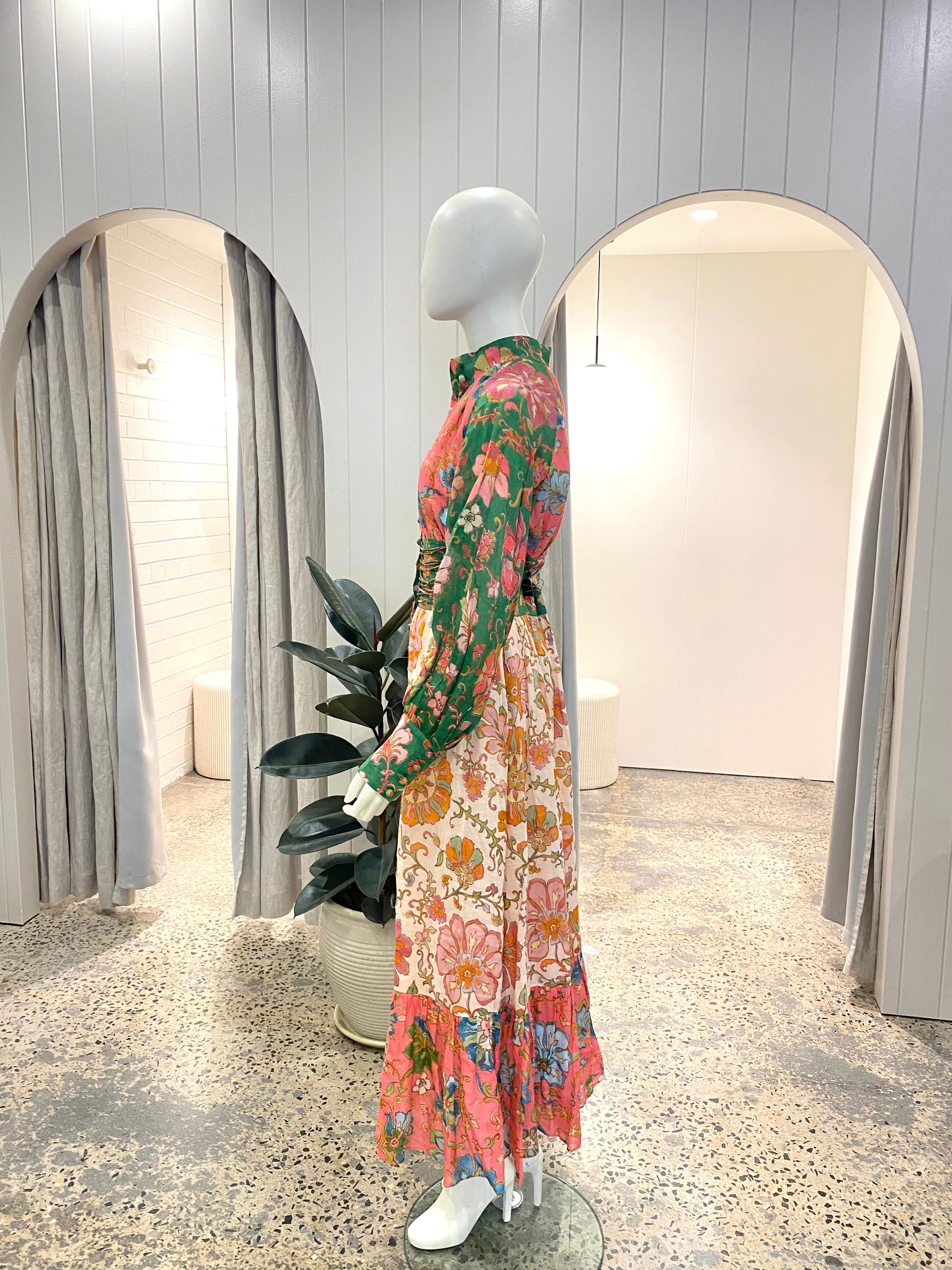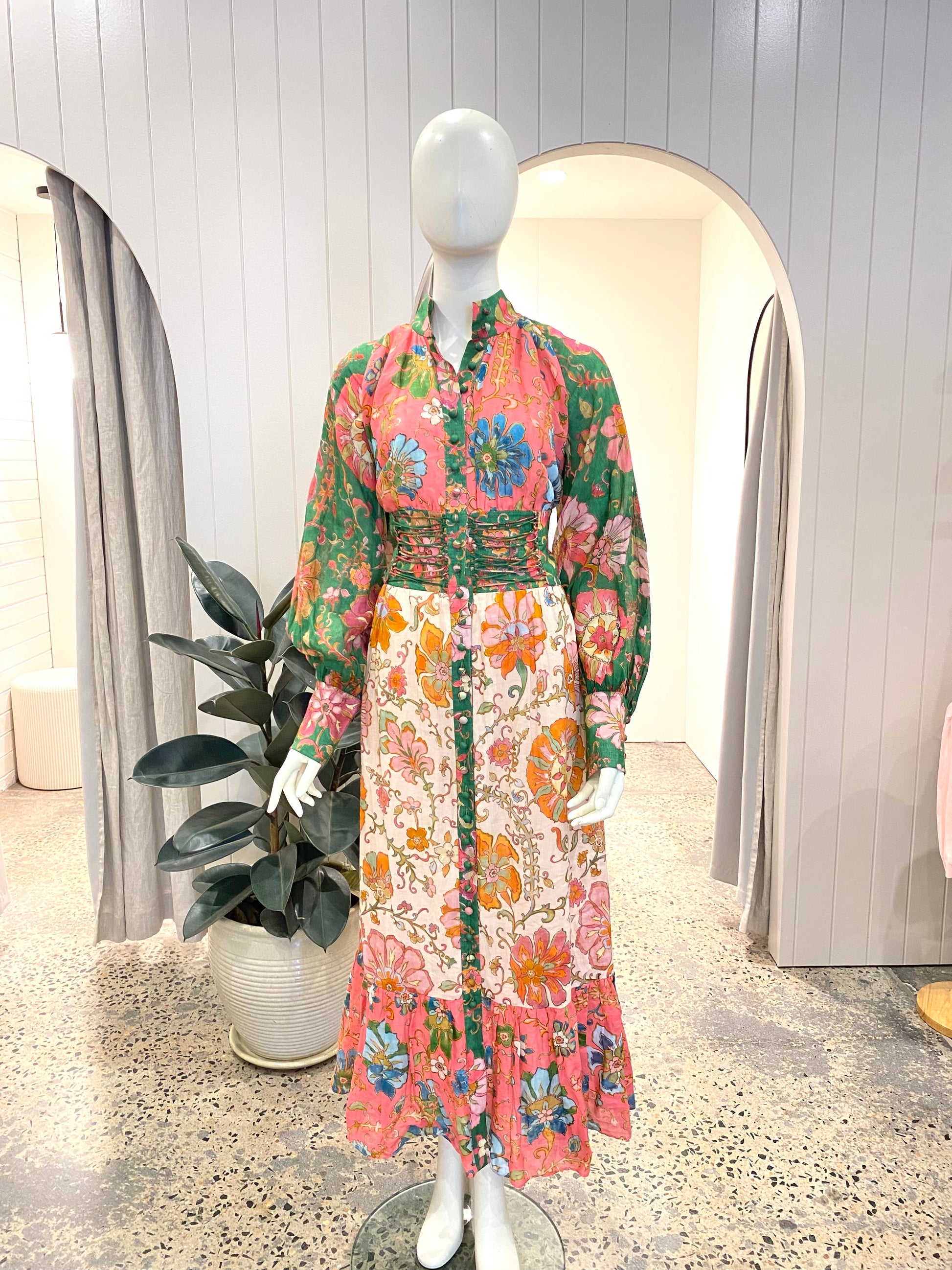 Description : - Maxi length - Button down front - Stand collar - Corset style waist - Long sleeve with 4 fabric-covered buttons