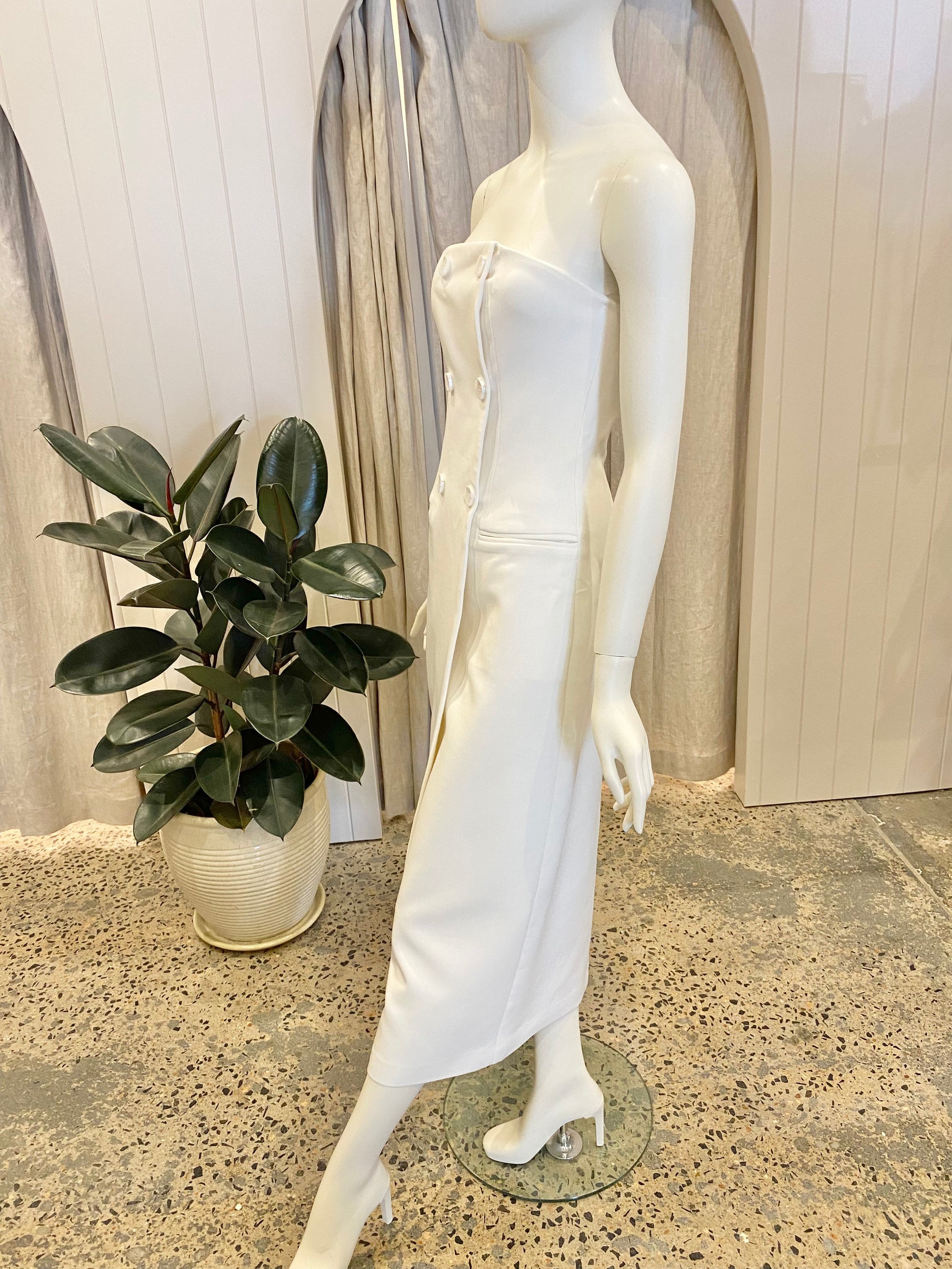Description : - Tailored Dress - Strapless - Midi Length - Boned Bodice - Stretch Fabrication - Front Button Detailing - Side Pockets (Non - Functional) - Side Front Split - Fully Lined - Centre Back Zip