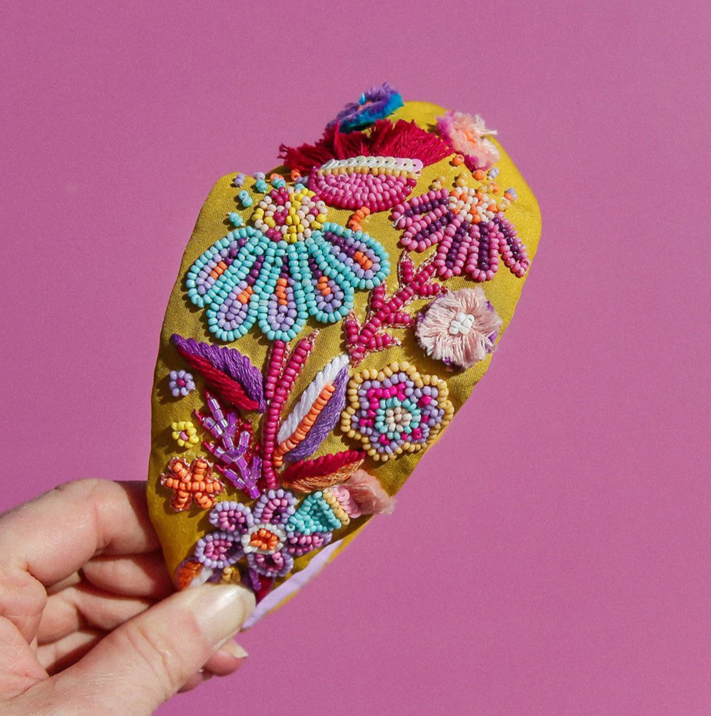Description : The Blossom Beaded Headband has been designed by Jemima Kingston in Australia. Exquisite detailing make this hand beaded headband a beautiful statement piece. The design is colourful, detailed and vibrant.