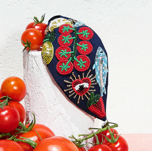 The Navy Pomodoro Beaded Headband has been designed by Jemima Kingston in Australia. Exquisite detailing make this hand beaded headband a beautiful statement piece. The design is colourful, detailed and vibrant.