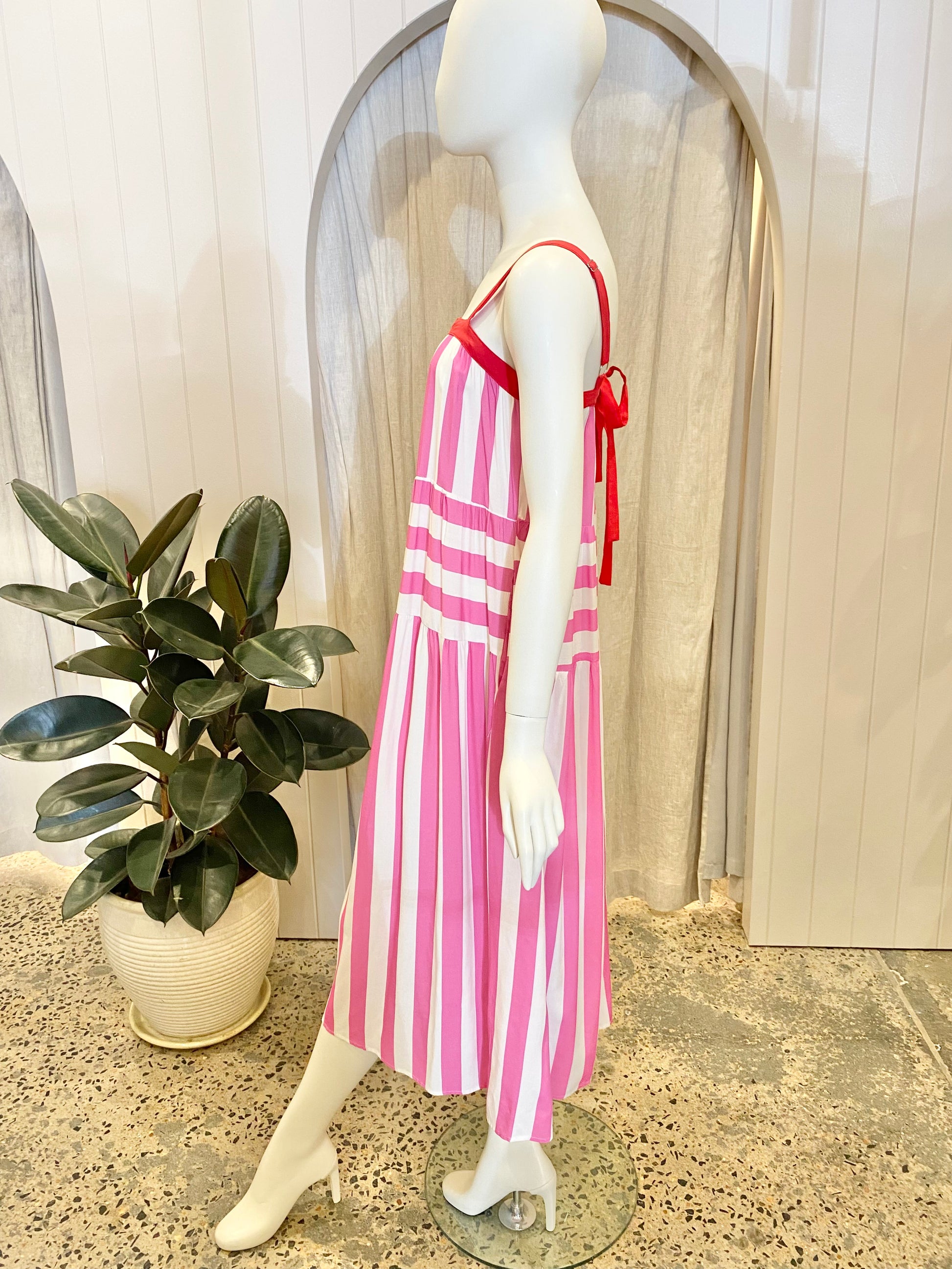 Description : _ Candy stripped print in pink/white - Adjustable straps - Midi length - Side pockets