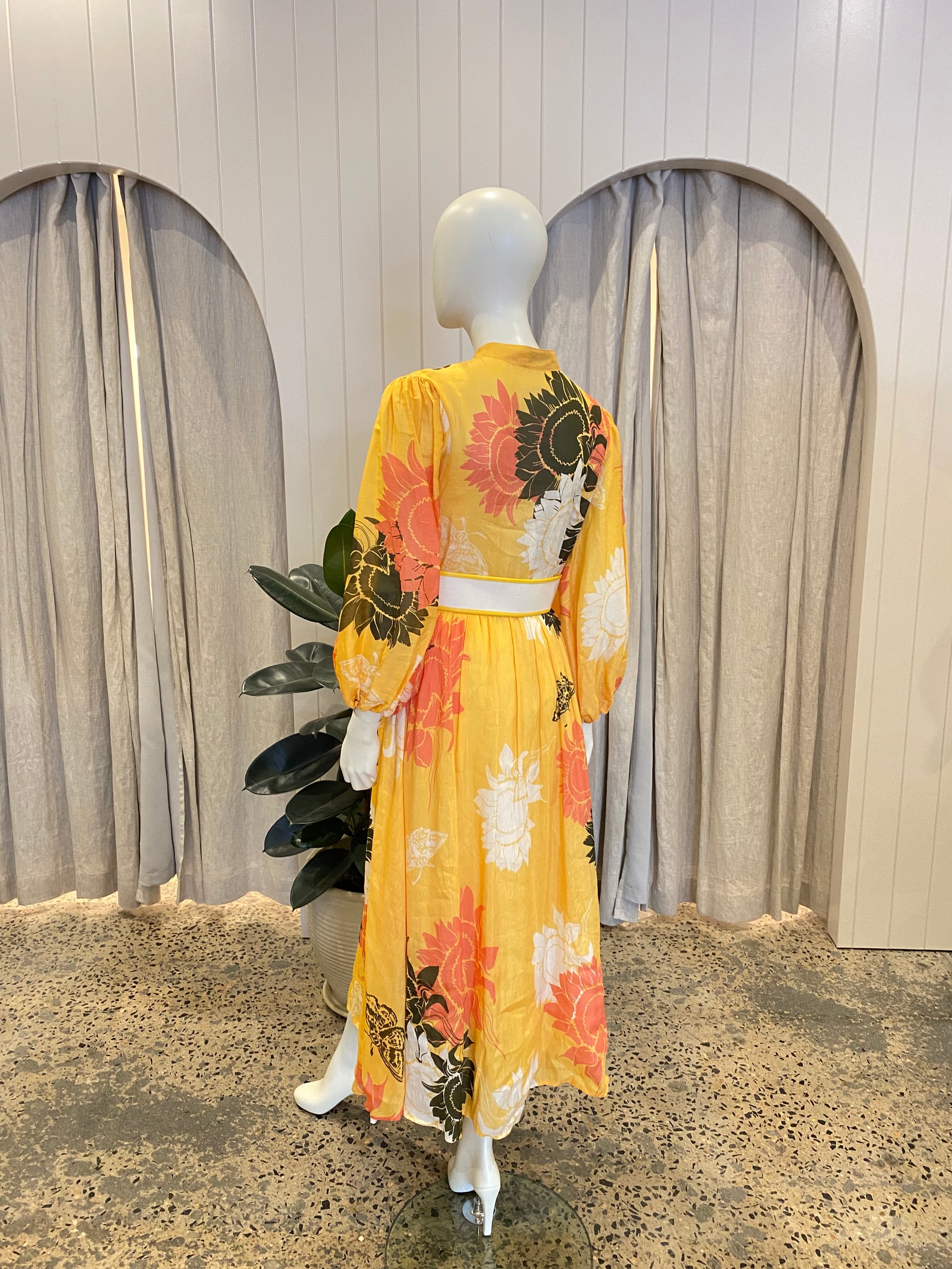 Description : Mandarin collar Front button opening Voluminous sleeves with elasticated cuff A-line flared midi skirt Matching belt included